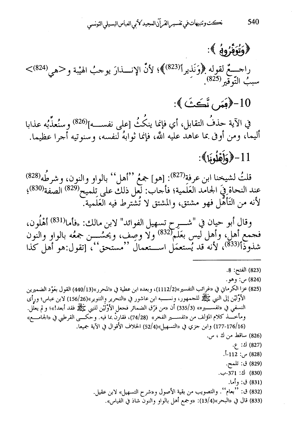 قلتُ لشيخنا ابن عرفة: هو جمعُ "أهل" بالواو والنون، وشرطُه عند النحاةِ في الجامد العَلَمية؛ فأجاب: لعل ذلك على تلميح الصفة؛ لأنه من التَأهُّل فهو مشتق، والمشتق لا تُشترط فيه العَلَمية.