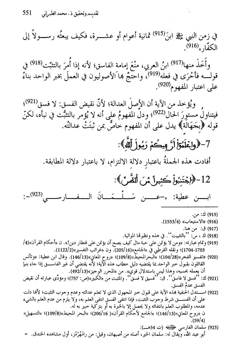 وأَخَذَ منها ابنُ العربي، منْعَ إمامة الفاسق؛ لأنه إذا أُمرَ بالتثبّت في قوله فأحْرَى في فعله، واحتجَّ بها الأصوليون في العمل بخبر الواحد بناءً على اعتبار المفهوم.