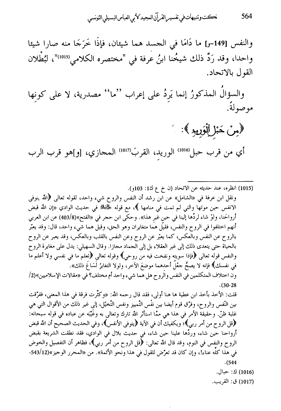 والنفس ما دَامَا في الجسد هما شيئان، فإذَا خَرَجَا منه صارا شيئا واحدا، وقد رَدَّ ذلك شيخُنا ابنُ عرفة في "مختصره الكلامي"، لبُطْلان القول بالاتحاد.