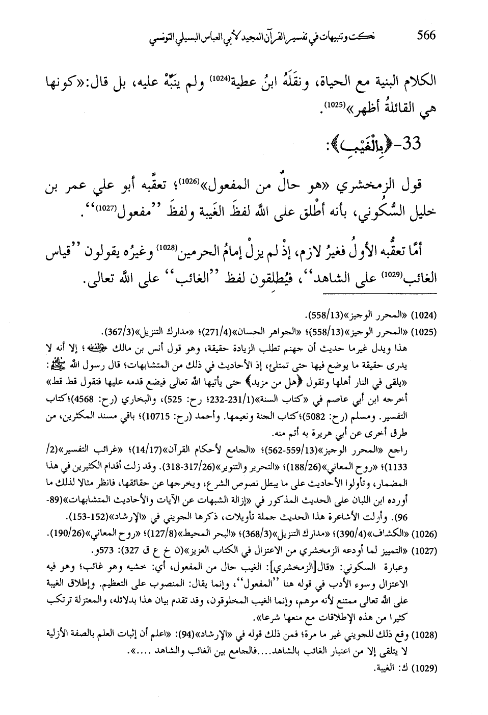 قول الزمخشري "هو حالٌ من المفعول"؛ تعقَّبه أبو على عمر بن خليل السُّكُوني، بأنه أطْلق على الله لفظَ الغَيبة ولفظَ "مفعول".
