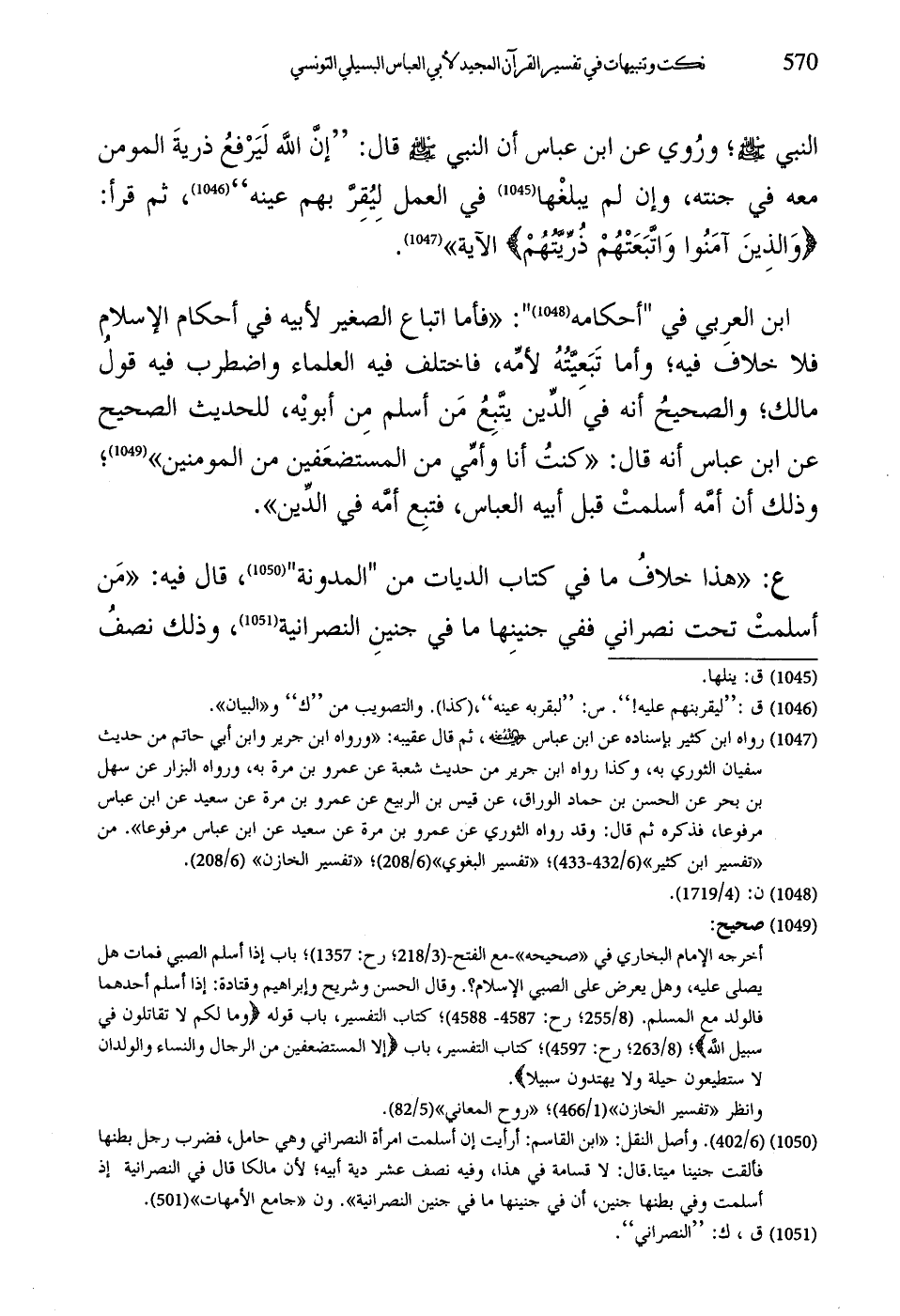 ابن العرِبي في "أحكامه": "فأما اتباع الصغير لأبيه في أحكام الإسلام فلا خلاف فيه؛ وأما تَبَعيَّتُهُ لأمِّه، فاختلف فيه العلماء واضطرب فيه قولُ مالك؛ والصحيحُ أنه في الدِّين يتَّبِعُ مَن أسلم مِن أبويْه، للحديث الصحيح عن ابن عباس أنه قال: "كنتُ أنا وأمِّي من المستضعَفين من المومنين"؛ وذلك أن أمَّه أسلمتْ قبل أبيه العباس، فتبِع أمَّه في الدِّين".