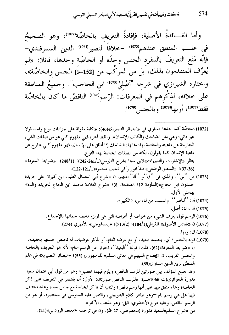 وأما الفائدةُ الأصلية، فإفادةُ التعريفِ بالخاصَّة، وهو الصحيحُ في علم المنطق عندهم -خلافاً لنصير الدين السمرقندي- فإنّه مَنَع التعريفَ بالمفرد الجنس وحدَه أو الخاصة وحدها، قائلا: "لم يُعرِّف المتقدمون بذلك، بل من المركَّب من الجنس والخاصة"، واختاره الشيرازي في شرحه "أصْلِيَّ ابنِ الحاجب". وجميعُ المناطقة على خلافه، لذِكْرِهم في اَلمعرفات: الرّسم الناقصُ ما كان بالخاصة فقط، أو بها وبالجنس.