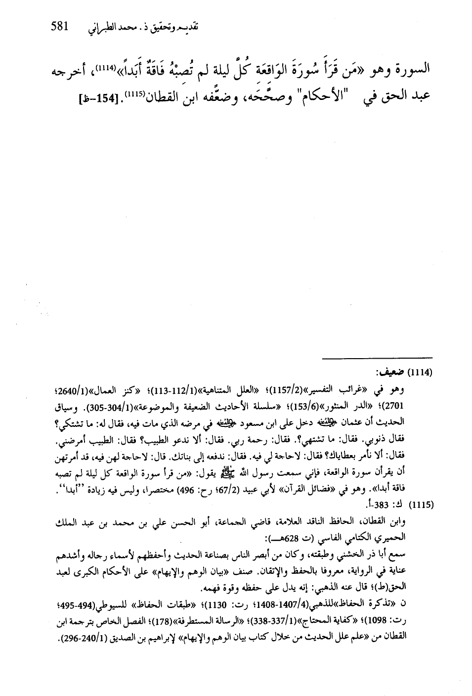 السورة وهو "مَن قَرَأَ سُورَةَ الوَاقِعَةِ كُل ليلةٍ لم تُصبْهُ فَاقَةٌ أَبَداً"، أخرجه عبد الحق في "الأحكام" وصححَه، وضعَّفه ابن القطان.