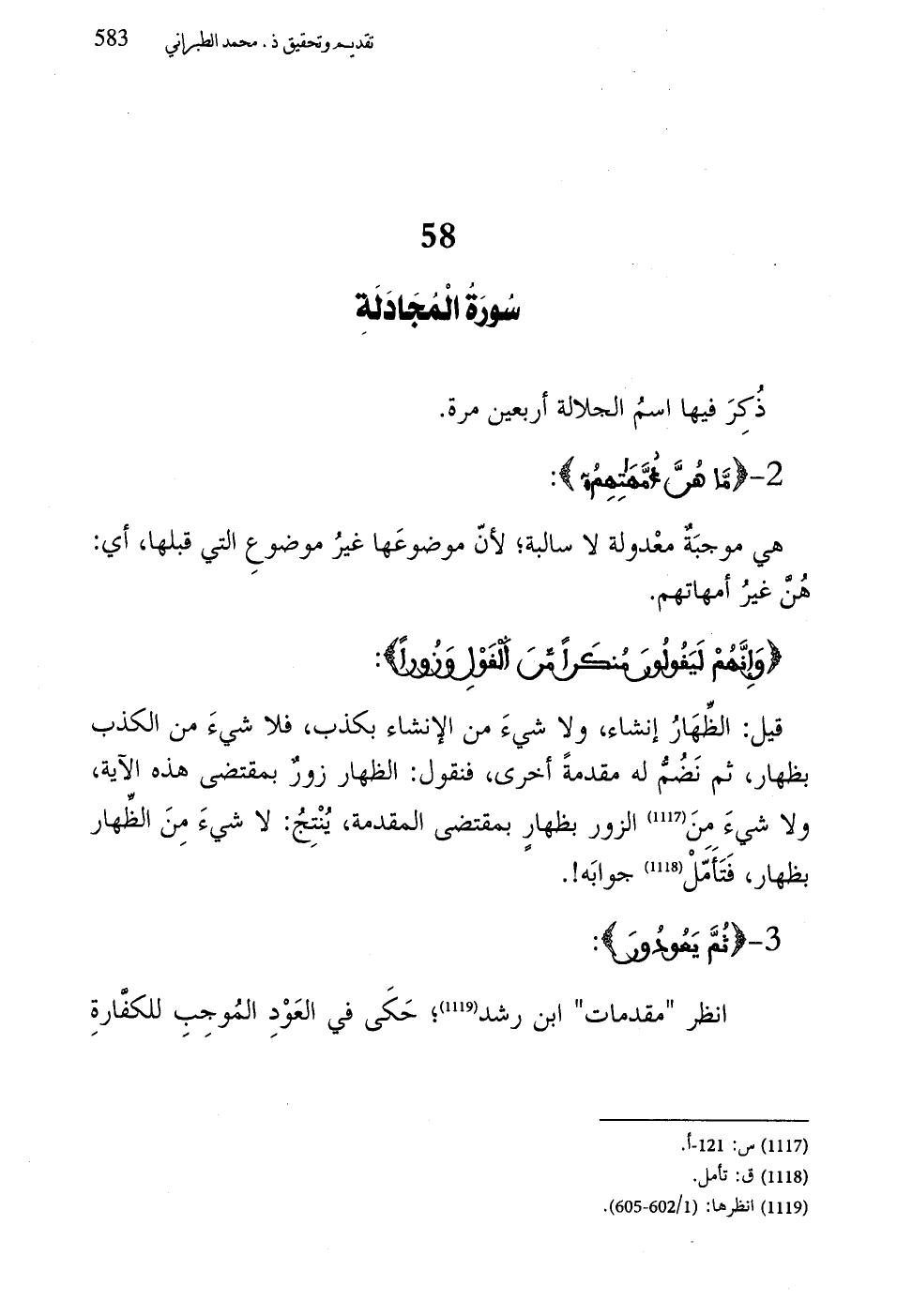 قيل: الظِّهَارُ إنشاء، ولا شيءَ منَ الإنشاء بكذب، فلا شيءَ من الكذب بظهار، ثم نَضُمُّ له مقدمةً أخرى، فنقول: الظهار زورٌ بمقتضى هذه الآية، ولا شيءَ مِنَ الزور بظهارٍ بمقتضى المقدمة، يُنْتِجُ: لا شيءَ مِنَ الظِّهار بظهار، فَتَأمَّلْ جوابَه!.
