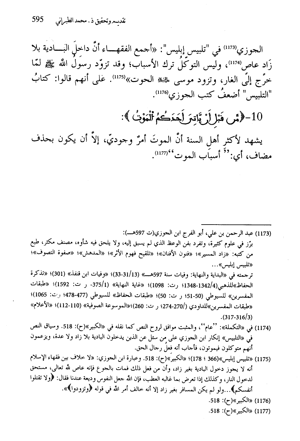 الجوزي في "تلبيس إبليس": "أجمع الفقهاء أن داخِلَ البادية بلا زَاد عاصٍ، وليس التوكّلُ ترك الأسباب؛ وقد تزوّد رسول الله - صلى الله عليه وسلم - لمّا خرج إلى لغار، وتزود موسى - عليه السلام - الحوت". على أنهم قالوا: كتابُ "التلبيس" أضعفُ كتب الجوزي.