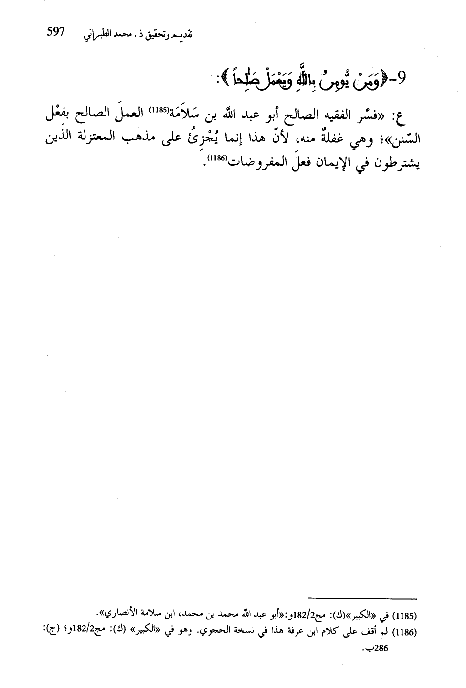 ع: "فسَّر الفقيه الصالح أبو عبد اللَّه بن سَلاَمَة العملَ الصالح بفعْل السّنن"؛ وهي غفلةٌ منه، لأنّ هذا إنما يُجْزِئُ على مذهب المعتزلة الذَين يشترطون في الإيمان فعلَ المفروضات.