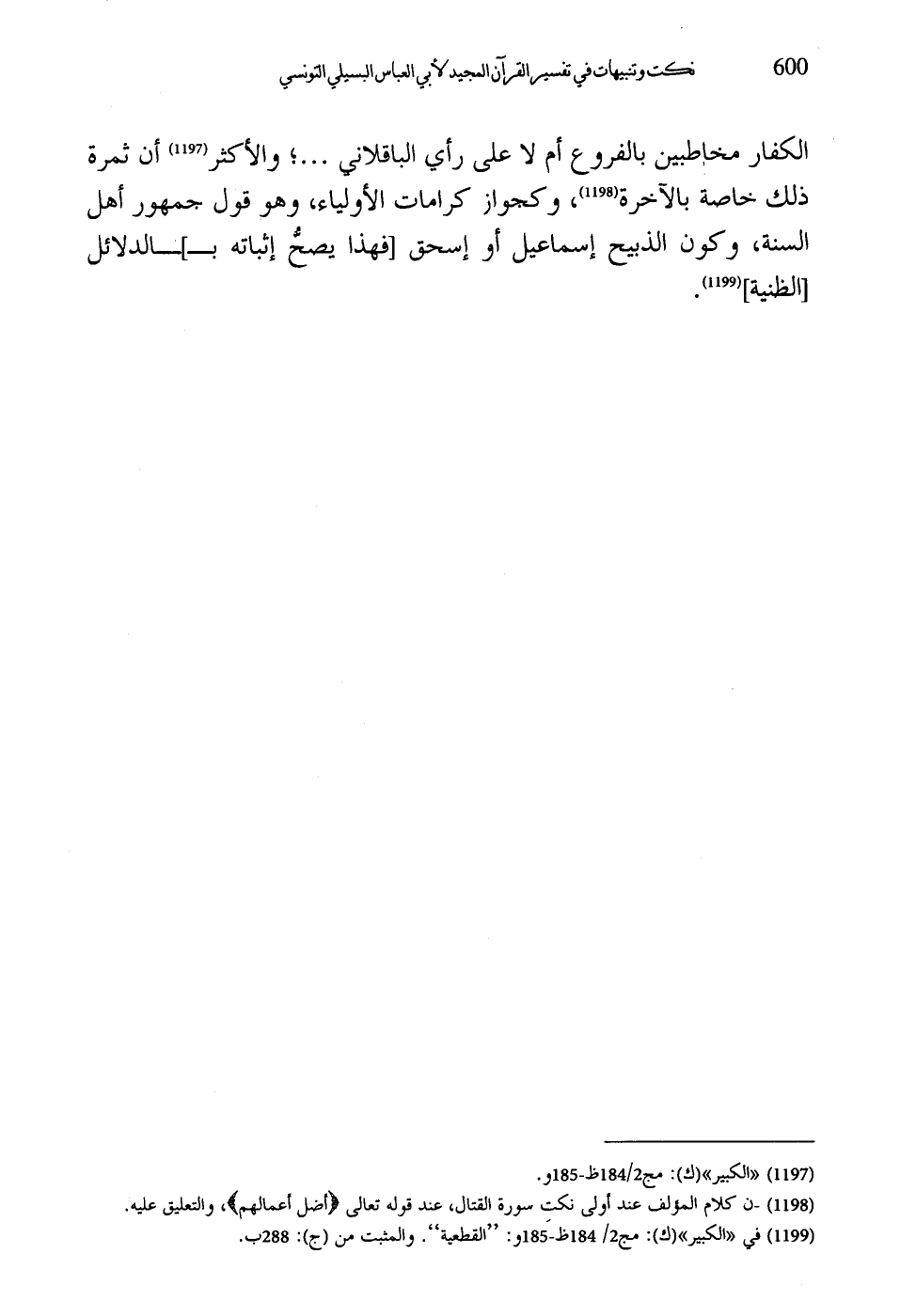 الكفار مخاطبين بالفروع أم لا على رأي الباقلاني ... ؛ والأكثر أن ثمرة ذلك خاصة بالآخرة، وكجواز كرامات الأولياء، وهو قول جمهور أهل السنة، وكون الذبيح إسماعيل أو إسحق فهذا يصحُّ إثباته بالدلائل الظنية.