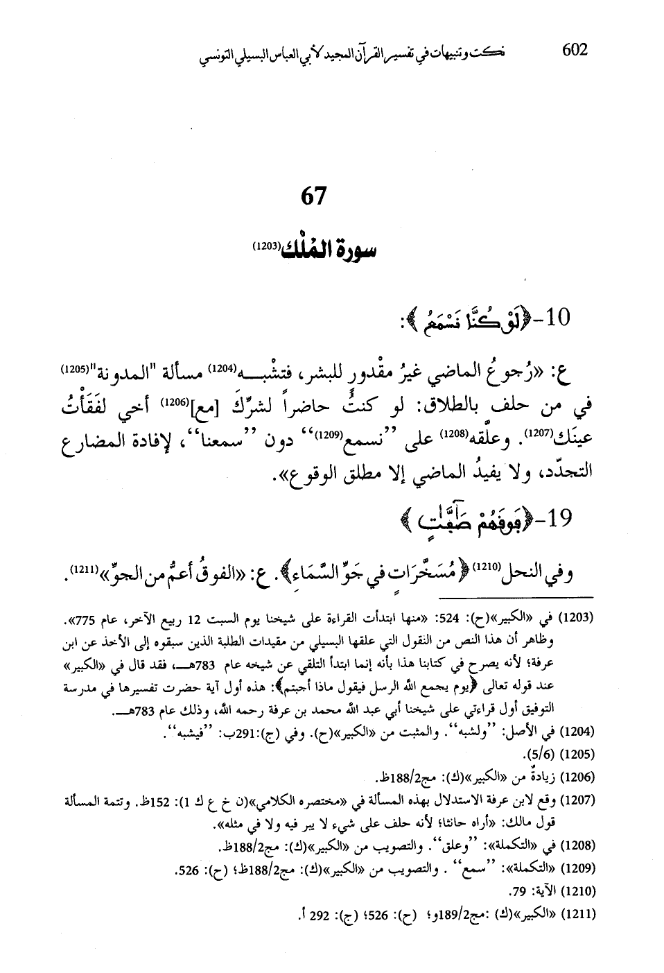 ع: "رُجوعُ الماضي غيرُ مقْدورٍ للبشر، فتشْبه مسألة "المدونة" في من حلف بالطلاق: لو كنتُ حاضراً لشرِّكَ مع أخي لفَقَأْتُ عينَك. وعلَّقه على "نسمع" دون "سمعنا"، لإفادة المضارع التجدّد، ولا يفيدُ الماضي إلا مطلق الوقوع".