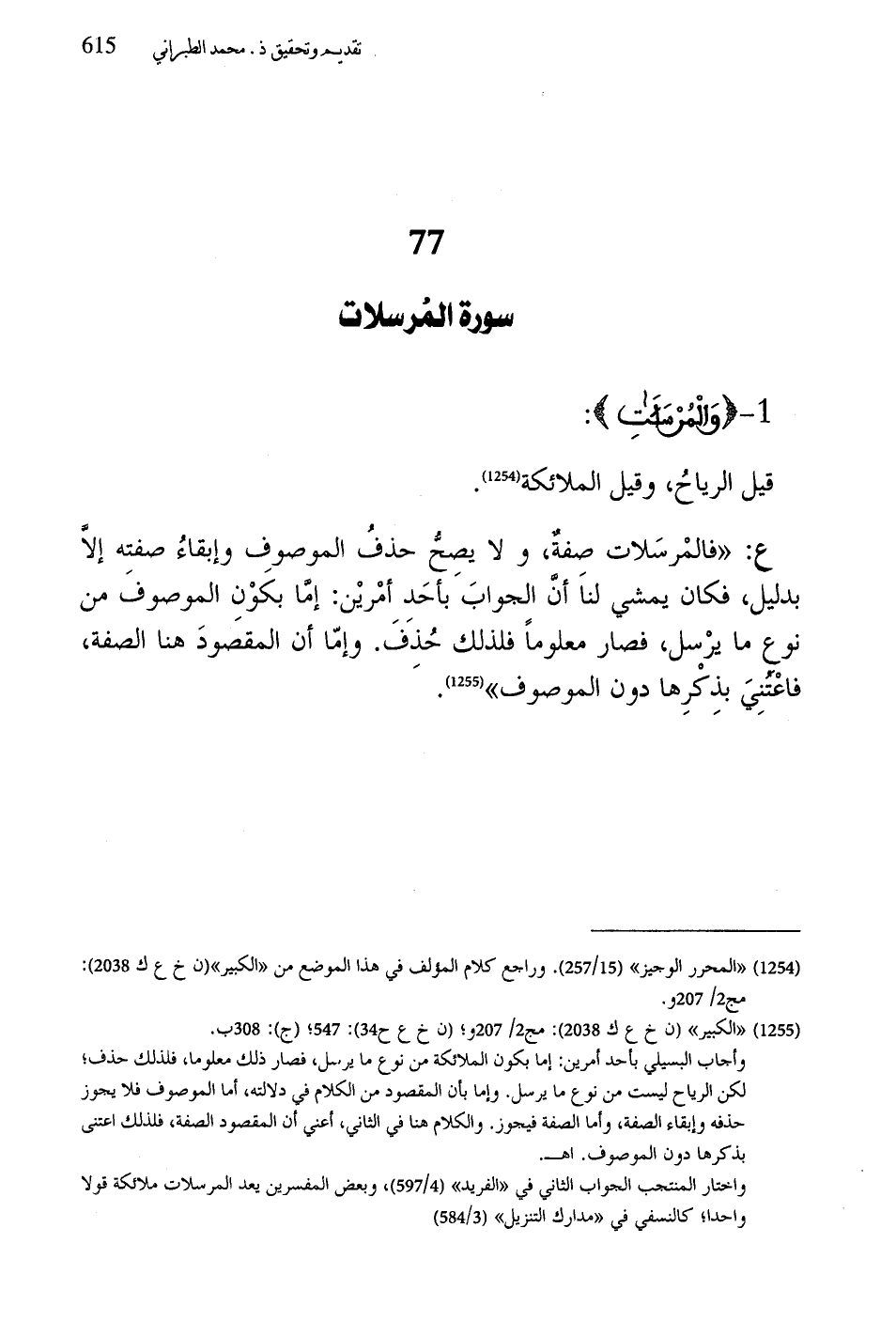 ع: "فالمْرسَلات صفةٌ، ولا يصِحُّ حذفُ الموصوف وإبقاءُ صفته إلا بدليل، فكان يمشي لناَ أنَّ الجوابَ بأحَدِ أمْريْن: إمَّا بكَوْن الموصوفَ من نوع ما يرْسل، فصار معلوماً فلذلك حُذِفَ. وإمّا أن المقصودَ هنا الصفة، فاعْتنِيَ بذِكْرِها دون الموصوف".