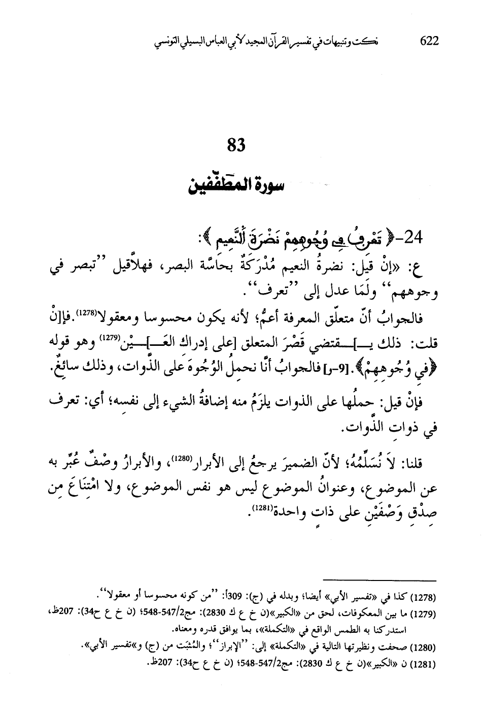 ع: "إنْ قيل: نضرةُ النعيم مُدْرَكةٌ بحاسة البصر، فهلاَّ قيل "تبصر في وجوههم" ولَمَا عدل إلى "تعرف".
