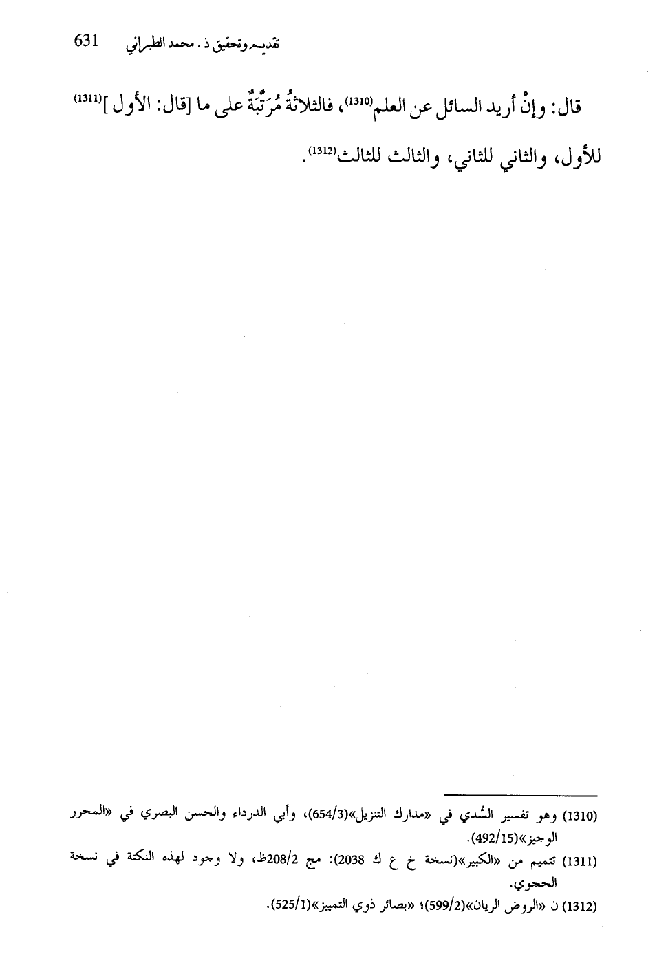 قال: وإنْ أريد السائل عن العلم، فالثلاثةُ مُرَتَّبَةٌ على ما قال: الأول للأول، والثاني للثاني، والثالث للثالث.