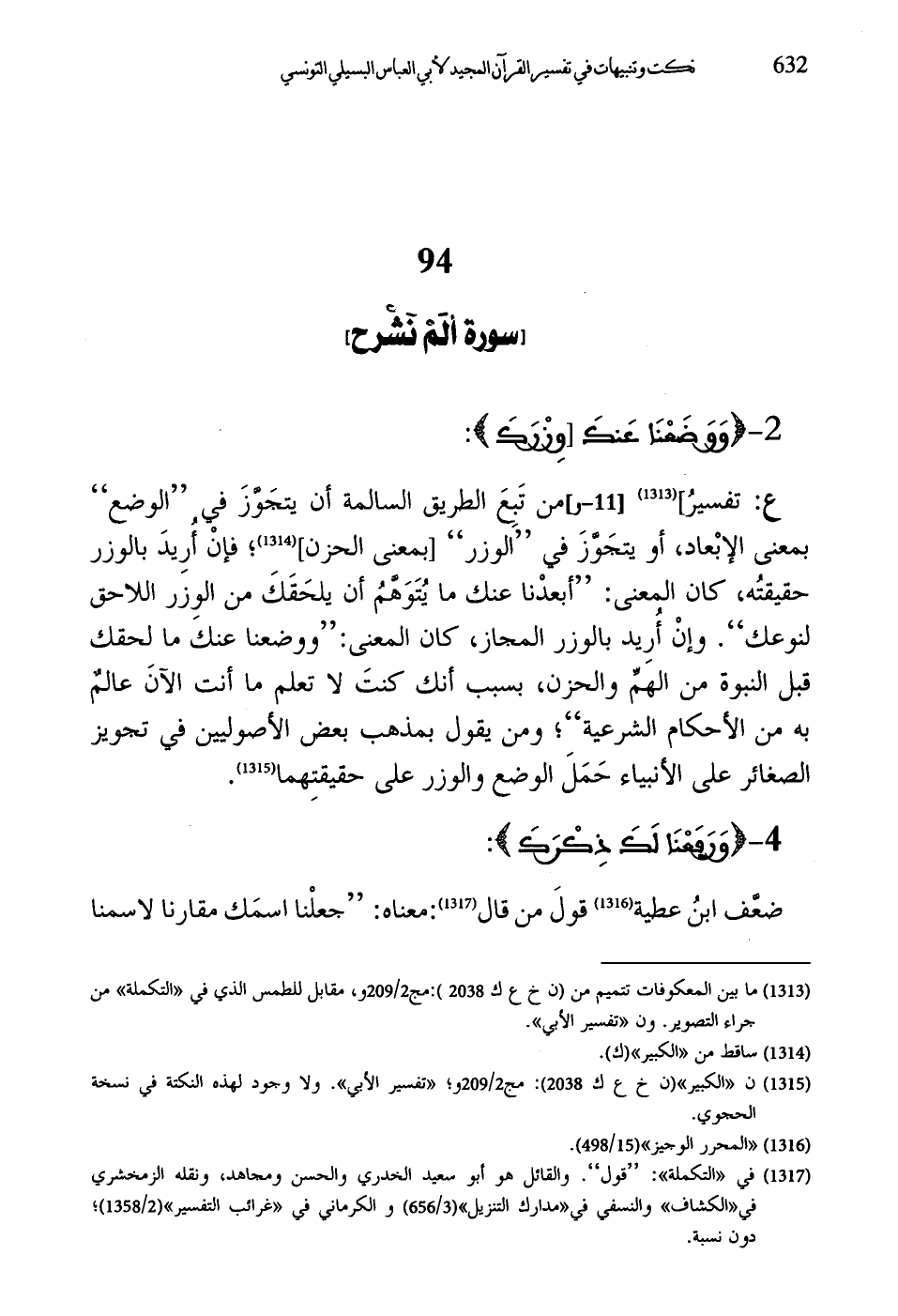 ع: تفسيرُ من تَبِعَ الطريق السالمة أن يتجَوزَ في "الوضع" بمعنى الإبْعاد، أو يتجَوَّزَ في "الوزر" بمعنى الحزن؛ فإنْ أُرِيدَ بالوزر حقيقتُه، كان المعنى: "أبعدْنا عنك ما يُتَوَهَّمُ أن يلحَقَكَ من الوِزر اللاحق لنوعك". وإنْ أُرِيد بالوزر المجاز، كان المعنى: "ووضعنا عنك ما لحقك قبل النبوة من الهمِّ والحزن، بسبب أنك كنتَ لا تعلم ما أنت الآنَ عالمٌ به من الأحكام الشرعية"؛ ومن يقول بمذهب بعض الأصوليين في تجويز الصغائر على الأنبياء حَمَلَ الوضع والوزر على حقيقتِهما.