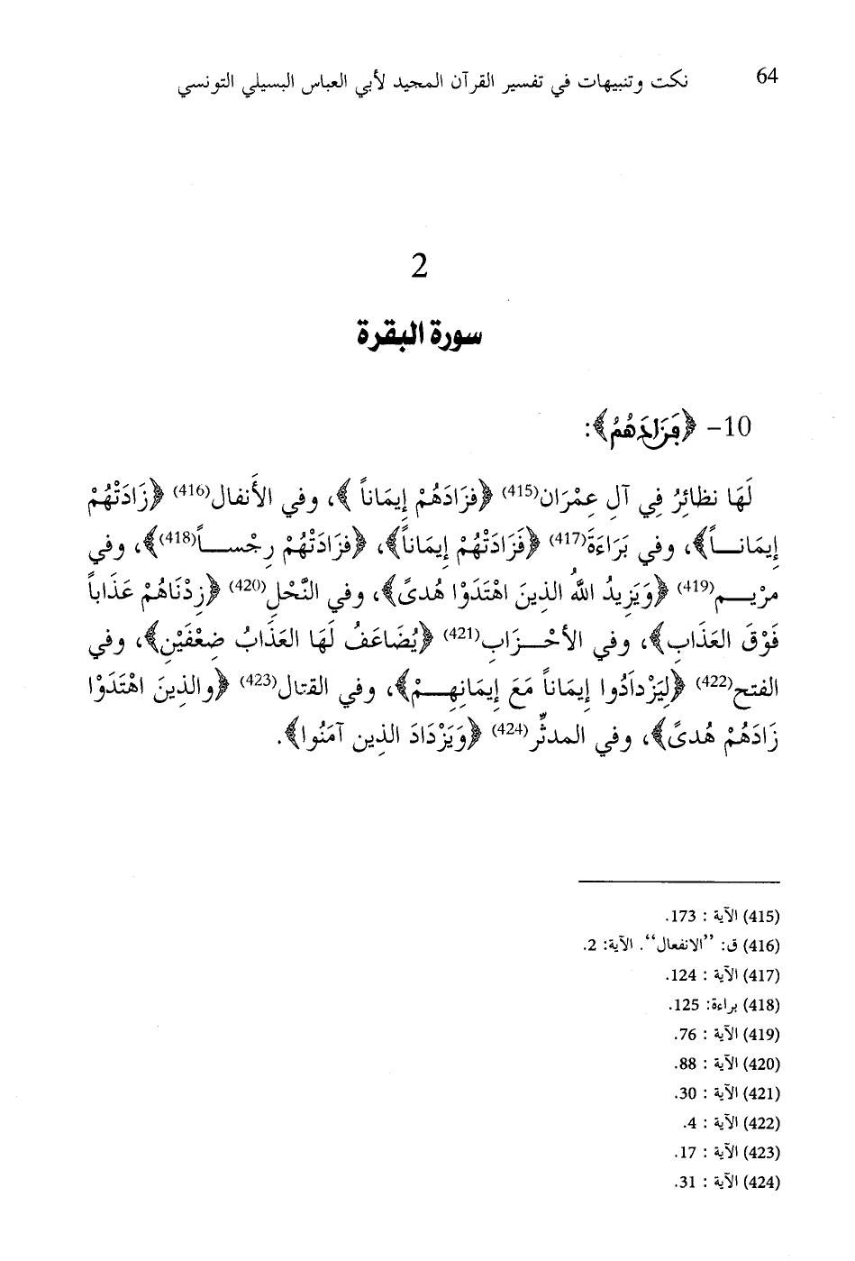 لَهَا نظائِرُ فِي آلِ عمْرَان (فزَادَهُمْ إٍيمَاناً)، وفي الأَنفال (زَادَتْهُمْ إِيمَاناً)، وفي بَرَاءَةً (فَزَادَتْهُمْ إِيمَاناً)، (فزَادَتْهُمْ رِجْساً)، وفي مرْيم (وَيَزِيدُ اللَّهُ الذِينَ اهْتَدَوْا هُدىً)، وفي النحْلِ (زِدْنَاهُمْ عَذَاباً فَوْقَ العَذَاب)، وفي الأحْزَابِ (يُضَاعَفُ لَهَا العَذَابُ ضعْفَيْنِ)، وفي الفتح (لِيَزْداَدُوا إِيمَاناً مَعَ إيمَانِهِمْ)، وفي القتال (والذينَ اهْتَدَوْا زَادَهُمْ هُدىً)، وفي المدثِّر (وَيَزْدَادَ الذِين آمَنُوا).