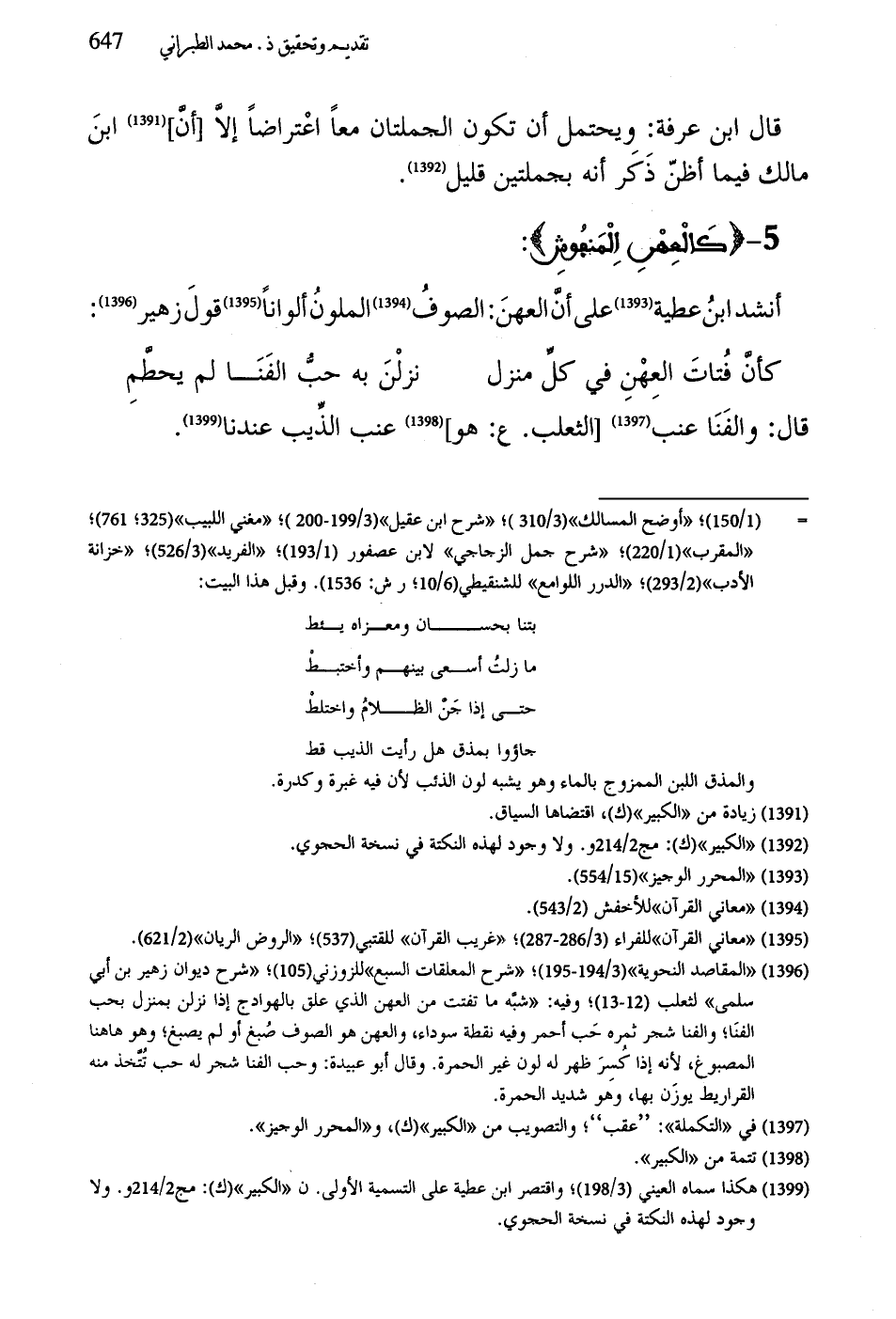 أنشد ابنُ عطية على أنَّ العهنَ: الصوفُ الملون ألواناً قولَ زهير: