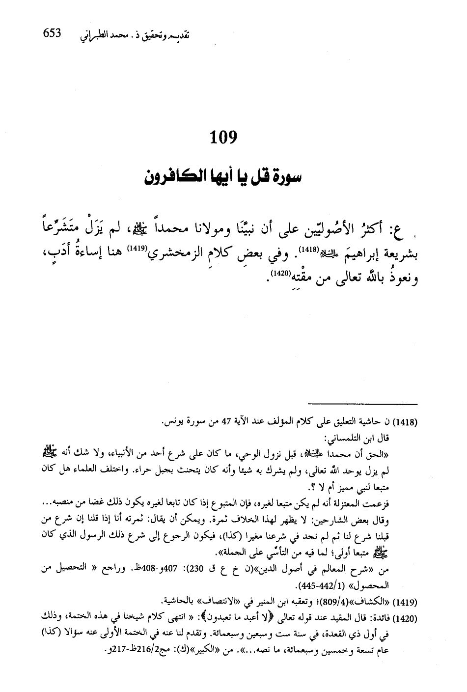 ع: أكثرُ الأصُوليّين على أن نبيَّنَا ومولانا محمداً - صلى الله عليه وسلم -، لم يَزَلْ متَشَرِّعاً بشريعة إبراهيمَ - عليه السلام -. وفي بعضِ كلامِ الزمخشري هنا إساءةُ أدَبٍ، ونعوذُ باللَّه تعالى من مقْتِهِ.
