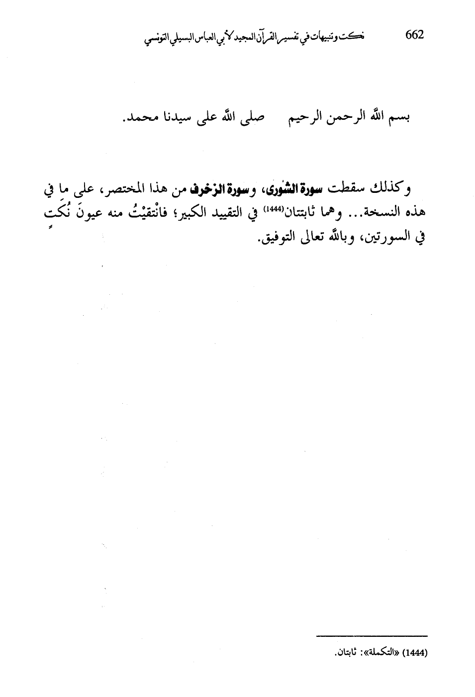 وكذلك سقطت سورة الشورى، وسورة الزخرف من هذا المختصر، على ما في هذه النسخة ... وهما ثابتتان في التقييد الكبير؛ فانْتقيْتُ منه عيون نُكَتٍ في السورتين، وباللَّه تعالى التوفيق.
