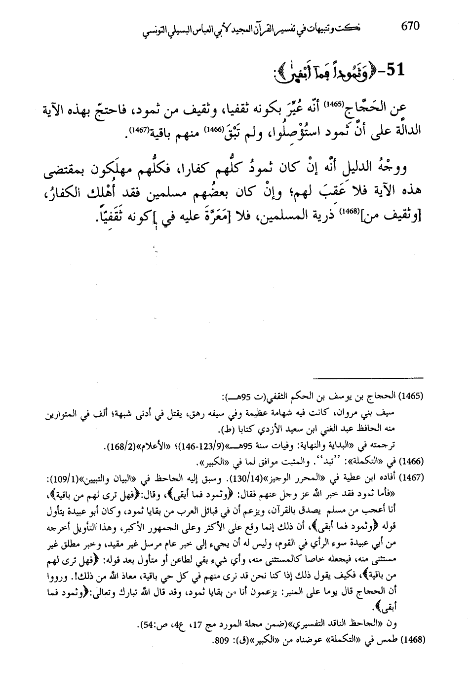 ووجْهُ الدليلِ أنَّه إنْ كان ثمودُ كلُّهم كفارا، فكلُّهم مهلَكون بمقتضى هذه الآية فلا عَقِبَ لهم؛ وإنْ كان بعضُهم مسلمين فقد أُهْلك الكفارُ، وثقيف من ذرية المسلمين، فلا مَعَرَّةَ عليه في كونه ثَقَفِيًّا.