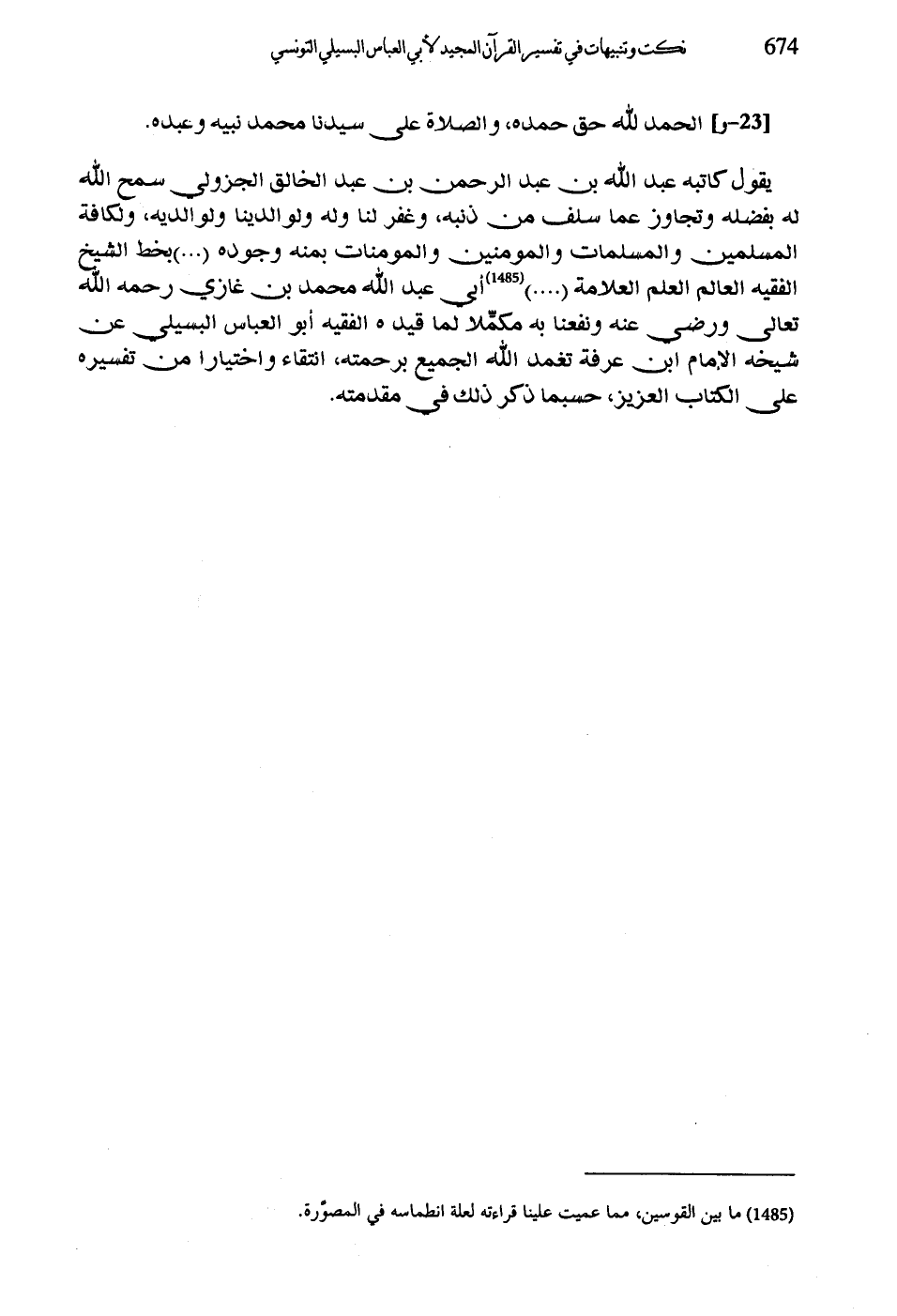 يقول كاتبه عبد الله بن عبد الرحمن بن عبد الخالق الجزولي سمح الله له بفضله وتجاوز عما سلف من ذنبه، وغفر لنا وله ولوالدينا ولوالديه، ولكافة المسلمين والمسلمات والمومنين والمومنات بمنه وجوده ( ... ) بخط الشيخ الفقيه العالم العلم العلامة ( .... ) (¬1) أبي عبد الله محمد بن غازي رحمه الله تعالى ورضي عنه ونفعنا به مكَمِّلا لما قيَّده الفقيه أبو العباس البسيلى عن شيخه الإمام ابن عرفة تغمد الله الجميع برحمته، انتقاء واختيارا من تفسيره على الكتاب العزيز، حسبما ذكر ذلك في مقدمته.