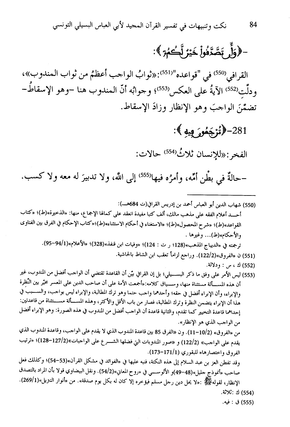 القرافي في "قواعده": "ثوابُ الواجب أعظمُ من ثواب المندوب"، ودلَّتِ الآيةُ على العكس؛ وجوابُه أنّ المندوب هنا -وهو الإسقاطُ- تضمَّنَ الواجبَ وهو الإنظار وزادَ الإسقاط.