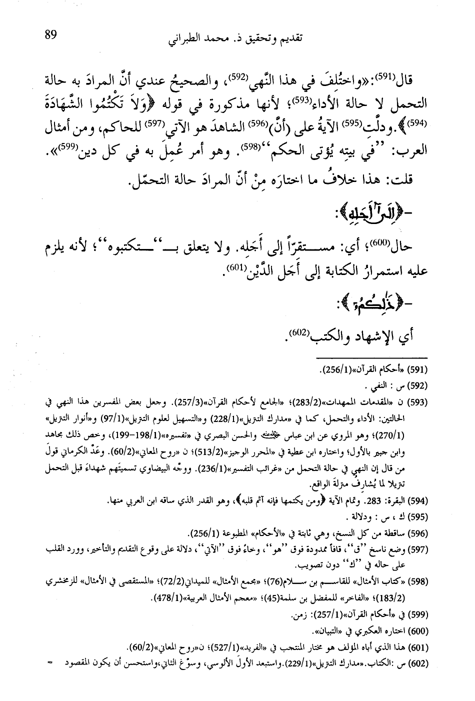 قال: "واختُلفَ في هذا النَّهي، والصحيحُ عندي أن المرادَ به حالة التحمل لا حالة الأداء؛ لأنها مذكورة في قوله (وَلاَ تَكْتُمُوا الشهَادَةَ). ودلَّتِ الآيةُ على أنَّ الشاهدَ هو الآتي للحاكم، ومن أمثال العرب: "في بيتِه يُؤتى الحكم". وهو أمر عُمِلَ به في كل دين".