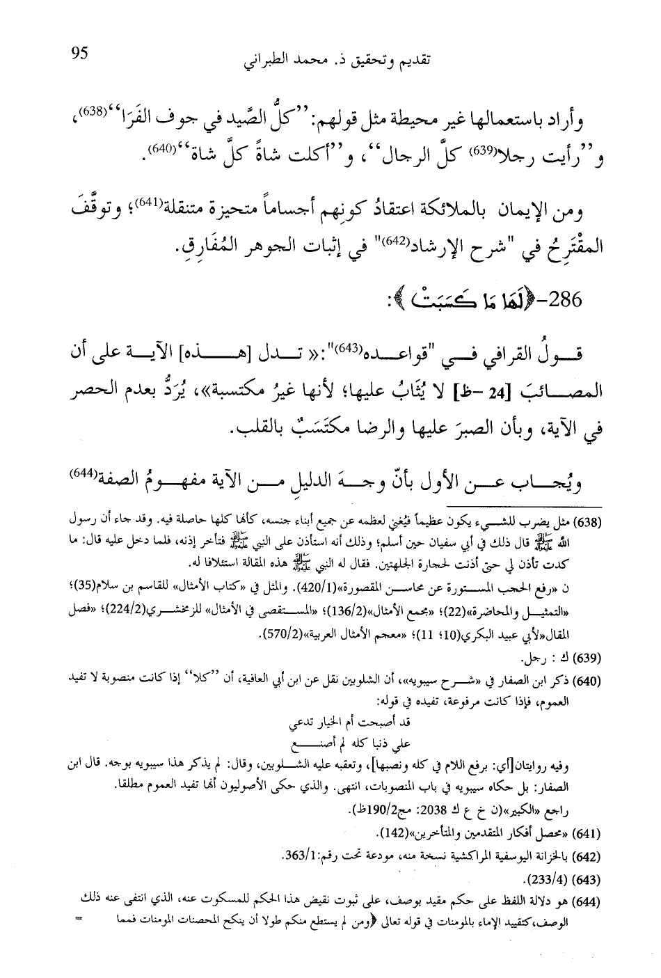 وأراد باستعمالها غير محيطة مثل قولهم: "كلّ الصَّيد في جوف الفَرَا"، و "رأيت رجلا كلَّ الرجال"، و "أكلت شاةً كلَّ شاة".