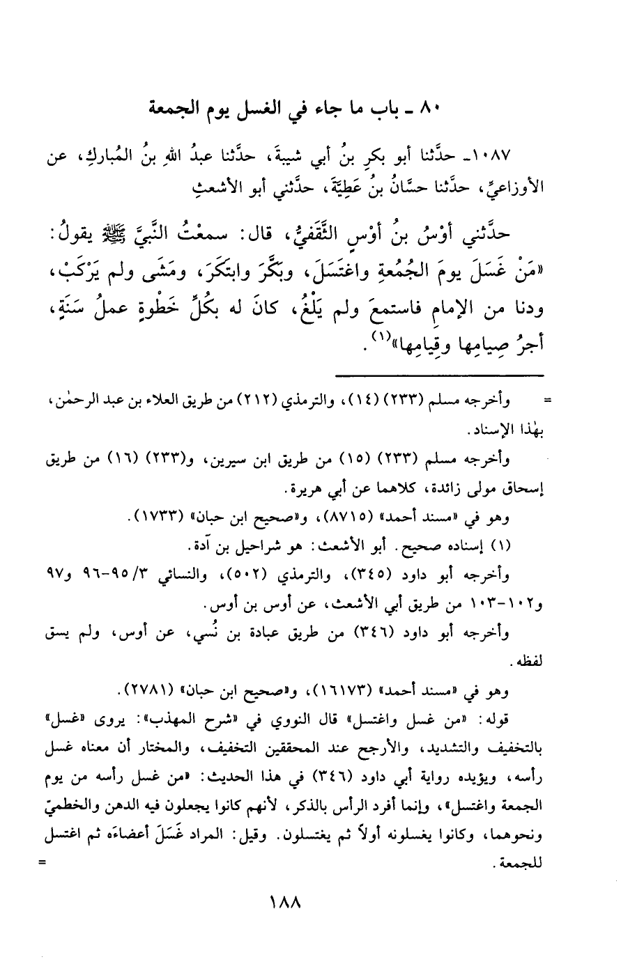 1087- حَدَّثَنَا أَبُو بَكْرِ بْنُ أَبِي شَيْبَةَ ، حَدَّثَنَا عَبْدُ اللهِ بْنُ الْمُبَارَكِ ، عَنِ الأَوْزَاعِيِّ ، حَدَّثَنَا حَسَّانُ بْنُ عَطِيَّةَ , حَدَّثَنِي أَبُو الأَشْعَثِ , حَدَّثَنِي أَوْسُ بْنُ أَوْسٍ الثَّقَفِيُّ ، قَالَ : سَمِعْتُ النَّبِيَّ صَلَّى الله عَليْهِ وسَلَّمَ يَقُولُ : مَنْ غَسَّلَ يَوْمَ الْجُمُعَةِ وَاغْتَسَلَ ، وَبَكَّرَ وَابْتَكَرَ ، وَمَشَى وَلَمْ يَرْكَبْ ، وَدَنَا مِنَ الإِمَامِ ، فَاسْتَمَعَ وَلَمْ يَلْغُ ، كَانَ لَهُ بِكُلِّ خَطْوَةٍ عَمَلُ سَنَةٍ ، أَجْرُ صِيَامِهَا وَقِيَامِهَا.