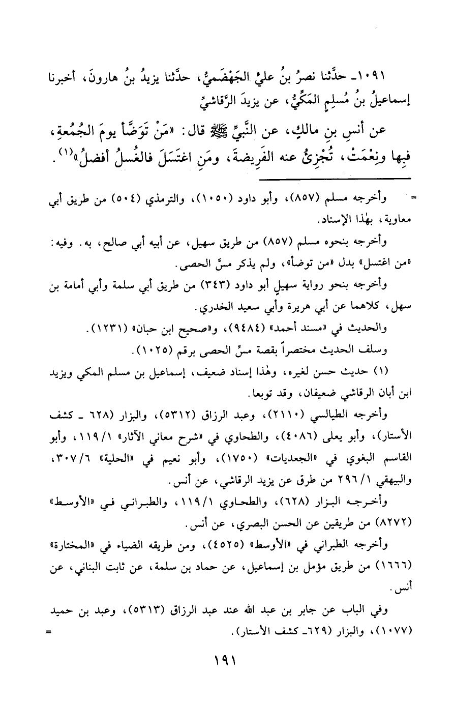 1091- حَدَّثَنَا نَصْرُ بْنُ عَلِيٍّ الْجَهْضَمِيُّ ، حَدَّثَنَا يَزِيدُ بْنُ هَارُونَ ، أَخْبَرَنَا إِسْمَاعِيلُ بْنُ مُسْلِمٍ الْمَكِّيُّ ، عَنْ يَزِيدَ الرَّقَاشِيِّ ، عَنْ أَنَسِ بْنِ مَالِكٍ ، عَنِ النَّبِيِّ صَلَّى الله عَليْهِ وسَلَّمَ قَالَ : مَنْ تَوَضَّأَ يَوْمَ الْجُمُعَةِ فَبِهَا وَنِعْمَتْ ، تُجْزِئُ عَنْهُ الْفَرِيضَةُ ، وَمَنِ اغْتَسَلَ فَالْغُسْلُ أَفْضَلُ.