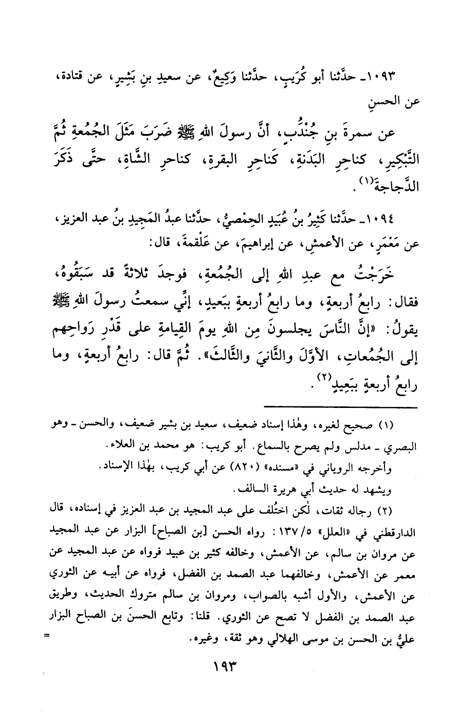 1093- حَدَّثَنَا أَبُو كُرَيْبٍ ، حَدَّثَنَا وَكِيعٌ ، عَنْ سَعِيدِ بْنِ بَشِيرٍ ، عَنْ قَتَادَةَ ، عَنِ الْحَسَنِ ، عَنْ سَمُرَةَ بْنِ جُنْدَبٍ ، أَنَّ رَسُولَ اللهِ صَلَّى الله عَليْهِ وسَلَّمَ ضَرَبَ مَثَلَ الْجُمُعَةِ ثُمَّ التَّبْكِيرِ : كَنَاحِرِ الْبَدَنَةِ ، كَنَاحِرِ الْبَقَرَةِ ، كَنَاحِرِ الشَّاةِ ، حَتَّى ذَكَرَ الدَّجَاجَةَ.