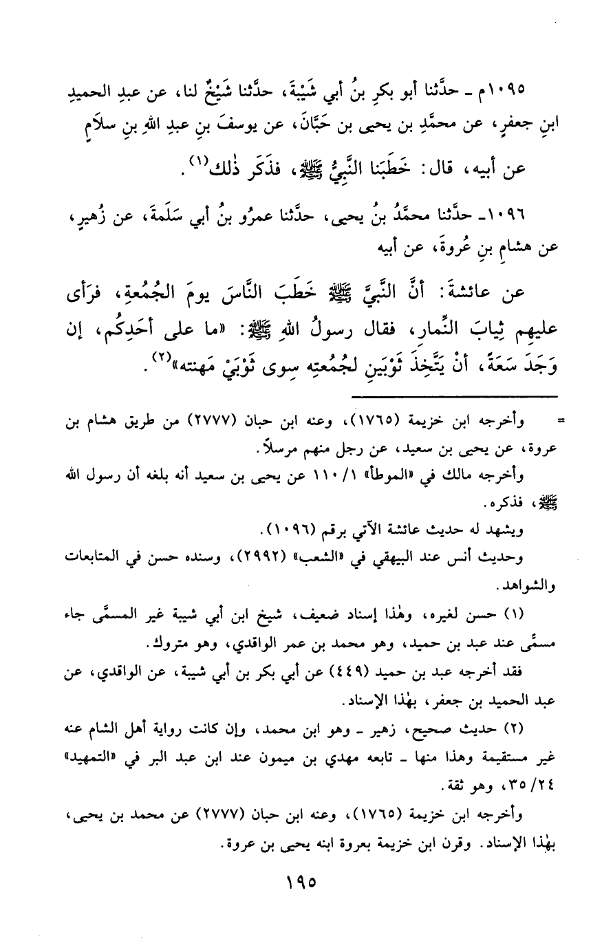 1096- حَدَّثَنَا مُحَمَّدُ بْنُ يَحْيَى ، حَدَّثَنَا عَمْرُو بْنُ أَبِي سَلَمَةَ ، عَنْ زُهَيْرٍ ، عَنْ هِشَامِ بْنِ عُرْوَةَ ، عَنْ أَبِيهِ ، عَنْ عَائِشَةَ ، أَنَّ النَّبِيَّ صَلَّى الله عَليْهِ وسَلَّمَ خَطَبَ النَّاسَ يَوْمَ الْجُمُعَةِ ، فَرَأَى عَلَيْهِمْ ثِيَابَ النِّمَارِ ، فَقَالَ رَسُولُ اللهِ صَلَّى الله عَليْهِ وسَلَّمَ : مَا عَلَى أَحَدِكُمْ إِنْ وَجَدَ سَعَةً أَنْ يَتَّخِذَ ثَوْبَيْنِ لِجُمُعَتِهِ , سِوَى ثَوْبَيْ مَِهْنَتِهِ.