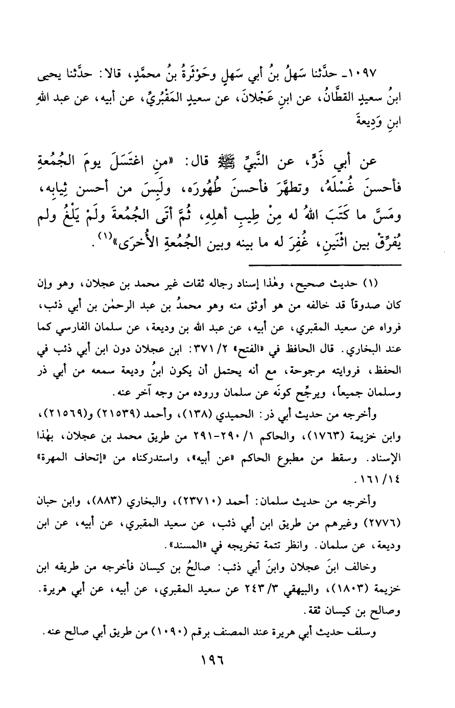1097- حَدَّثَنَا سَهْلُ بْنُ أَبِي سَهْلٍ ، وَحَوْثَرَةُ بْنُ مُحَمَّدٍ ، قَالاَ : حَدَّثَنَا يَحْيَى بْنُ سَعِيدٍ الْقَطَّانُ ، عَنِ ابْنِ عَجْلاَنَ ، عَنْ سَعِيدٍ الْمَقْبُرِيِّ ، عَنْ أَبِيهِ ، عَنْ عَبْدِ اللهِ بْنِ وَدِيعَةَ ، عَنْ أَبِي ذَرٍّ ، عَنِ النَّبِيِّ صَلَّى الله عَليْهِ وسَلَّمَ قَالَ : مَنِ اغْتَسَلَ يَوْمَ الْجُمُعَةِ فَأَحْسَنَ غُسْلَهُ ، وَتَطَهَّرَ فَأَحْسَنَ طُهُورَهُ ، وَلَبِسَ مِنْ أَحْسَنِ ثِيَابِهِ ، وَمَسَّ مَا كَتَبَ اللَّهُ لَهُ مِنْ طِيبِ أَهْلِهِ ، ثُمَّ أَتَى الْجُمُعَةَ وَلَمْ يَلْغُ , وَلَمْ يُفَرِّقْ بَيْنَ اثْنَيْنِ ، غُفِرَ لَهُ مَا بَيْنَهُ وَبَيْنَ الْجُمُعَةِ الأُخْرَى.