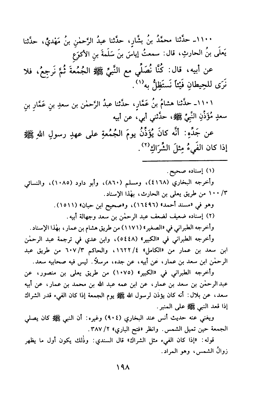 1100- حَدَّثَنَا مُحَمَّدُ بْنُ بَشَّارٍ ، حَدَّثَنَا عَبْدُ الرَّحْمَنِ بْنُ مَهْدِيٍّ ، حَدَّثَنَا يَعْلَى بْنُ الْحَارِثِ ، قَالَ : سَمِعْتُ إِيَاسَ بْنَ سَلَمَةَ بْنِ الأَكْوَعِ ، عَنْ أَبِيهِ ، قَالَ : كُنَّا نُصَلِّي مَعَ النَّبِيِّ صَلَّى الله عَليْهِ وسَلَّمَ الْجُمُعَةَ ، ثُمَّ نَرْجِعُ فَلاَ نَرَى لِلْحِيطَانِ فَيْئًا نَسْتَظِلُّ بِهِ.