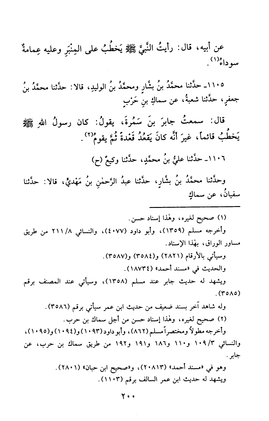 1105- حَدَّثَنَا مُحَمَّدُ بْنُ بَشَّارٍ ، وَمُحَمَّدُ بْنُ الْوَلِيدِ ، قَالاَ : حَدَّثَنَا مُحَمَّدُ بْنُ جَعْفَرٍ ، حَدَّثَنَا شُعْبَةُ ، عَنْ سِمَاكِ بْنِ حَرْبٍ ، قَالَ : سَمِعْتُ جَابِرَ بْنَ سَمُرَةَ يَقُولُ : كَانَ رَسُولُ اللهِ صَلَّى الله عَليْهِ وسَلَّمَ يَخْطُبُ قَائِمًا , غَيْرَ أَنَّهُ كَانَ يَقْعُدُ قَعْدَةً ثُمَّ يَقُومُ.