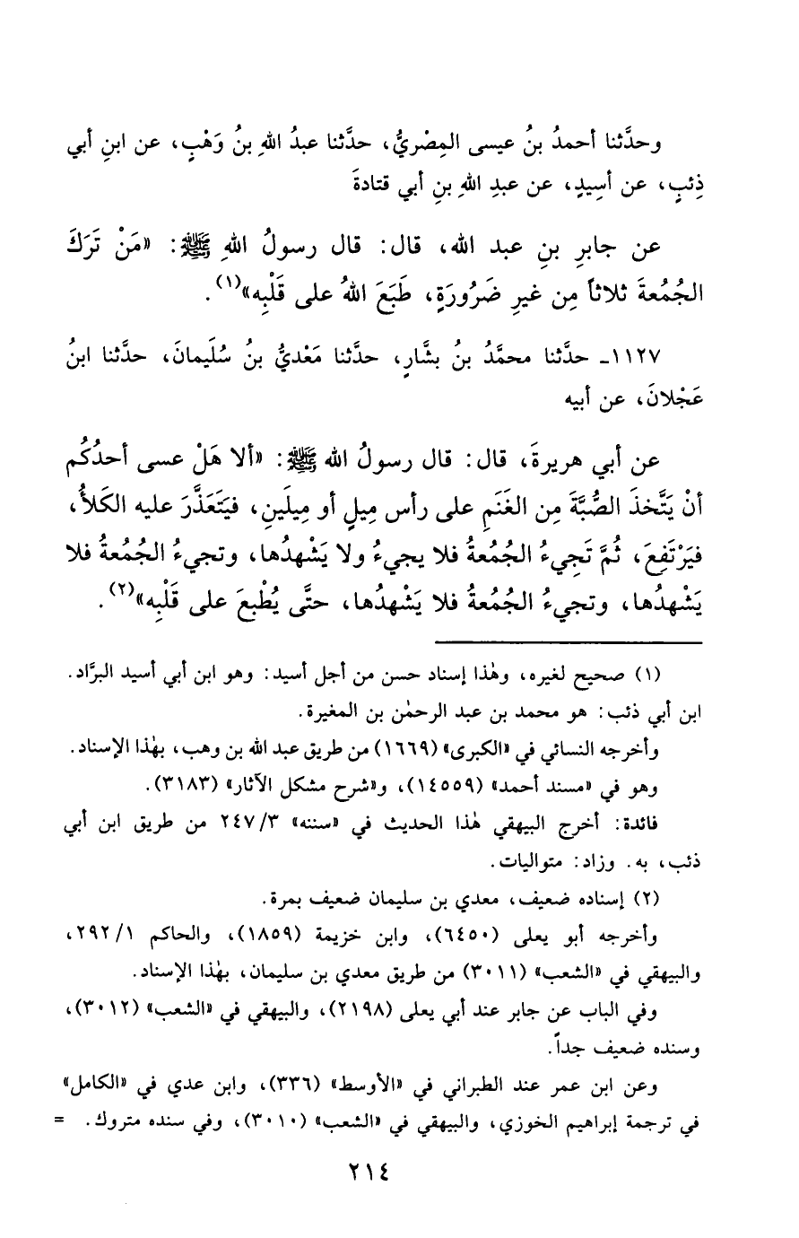 1127- حَدَّثَنَا مُحَمَّدُ بْنُ بَشَّارٍ ، حَدَّثَنَا مَعْدِيُّ بْنُ سُلَيْمَانَ ، حَدَّثَنَا ابْنُ عَجْلاَنَ ، عَنْ أَبِيهِ ، عَنْ أَبِي هُرَيْرَةَ ، قَالَ : قَالَ رَسُولُ اللهِ صَلَّى الله عَليْهِ وسَلَّمَ : أَلاَ هَلْ عَسَى أَحَدُكُمْ أَنْ يَتَّخِذَ الصُّبَّةَ مِنَ الْغَنَمِ عَلَى رَأْسِ مِيلٍ أَوْ مِيلَيْنِ ، فَيَتَعَذَّرَ عَلَيْهِ الْكَلأُ ، فَيَرْتَفِعَ ، ثُمَّ تَجِيءُ الْجُمُعَةُ فَلاَ يَجِيءُ وَلاَ يَشْهَدُهَا ، وَتَجِيءُ الْجُمُعَةُ فَلاَ يَشْهَدُهَا ، وَتَجِيءُ الْجُمُعَةُ فَلاَ يَشْهَدُهَا ، حَتَّى يُطْبَعَ عَلَى قَلْبِهِ.