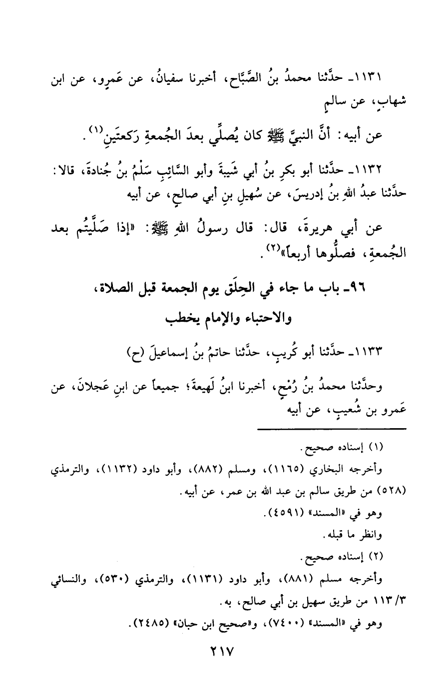 1131- حَدَّثَنَا مُحَمَّدُ بْنُ الصَّبَّاحِ ، أَخْبَرَنَا سُفْيَانُ ، عَنْ عَمْرٍو ، عَنِ ابْنِ شِهَابٍ ، عَنْ سَالِمٍ ، عَنْ أَبِيهِ ؛ أَنَّ النَّبِيَّ صَلَّى الله عَليْهِ وسَلَّمَ كَانَ يُصَلِّي بَعْدَ الْجُمُعَةِ رَكْعَتَيْنِ.