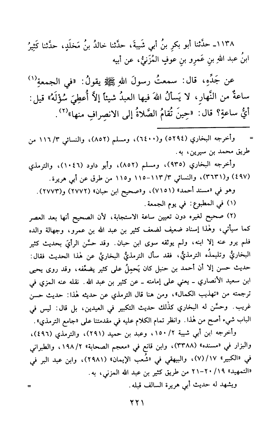 1138- حَدَّثَنَا أَبُو بَكْرِ بْنُ أَبِي شَيْبَةَ ، حَدَّثَنَا خَالِدُ بْنُ مَخْلَدٍ ، حَدَّثَنَا كَثِيرُ بْنُ عَبْدِ اللهِ بْنِ عَمْرِو بْنِ عَوْفٍ الْمُزَنِيُّ ، عَنْ أَبِيهِ ، عَنْ جَدِّهِ ، قَالَ : سَمِعْتُ رَسُول اللهِ صَلَّى الله عَليْهِ وسَلَّمَ يَقُولُ : فِي الْجُمُعَةِ سَاعَةٌ مِنَ النَّهَارِ ، لاَ يَسْأَلُ اللَّهَ فِيهَا الْعَبْدُ شَيْئًا إِلاَّ أُعْطِيَ سُؤْلَهُ , قِيلَ : أَيُّ سَاعَةٍ ؟ قَالَ : حِينَ تُقَامُ الصَّلاَةُ إِلَى الاِنْصِرَافِ مِنْهَا.