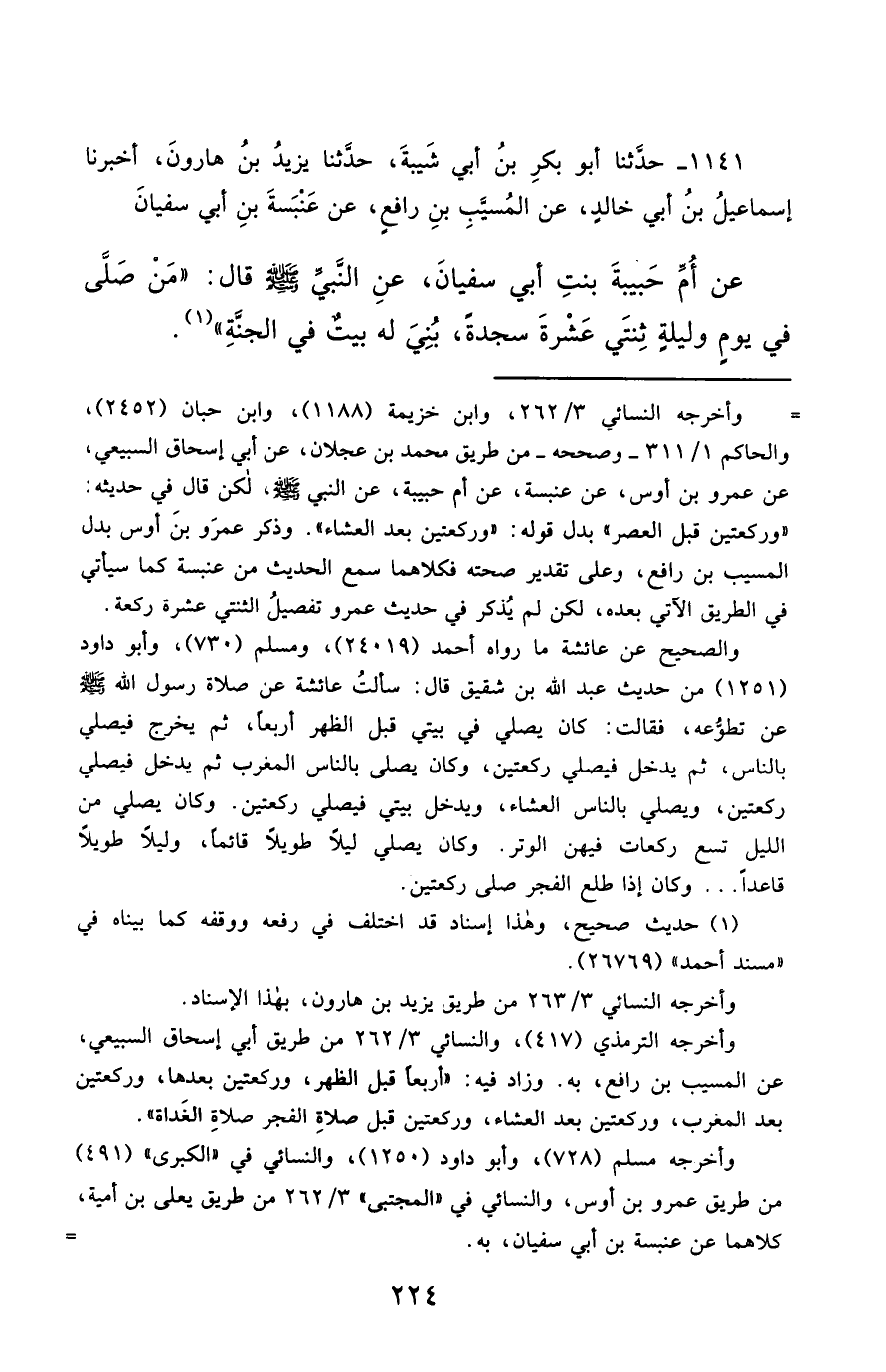 1141- حَدَّثَنَا أَبُو بَكْرِ بْنُ أَبِي شَيْبَةَ ، حَدَّثَنَا يَزِيدُ بْنُ هَارُونَ ، أَخْبَرَنَا إِسْمَاعِيلُ بْنُ أَبِي خَالِدٍ ، عَنِ الْمُسَيَّبِ بْنِ رَافِعٍ ، عَنْ عَنْبَسَةَ بْنِ أَبِي سُفْيَانَ ، عَنْ أُمِّ حَبِيبَةَ بِنْتِ أَبِي سُفْيَانَ ، عَنِ النَّبِيِّ صَلَّى الله عَليْهِ وسَلَّمَ قَالَ : مَنْ صَلَّى فِي يَوْمٍ وَلَيْلَةٍ ثِنْتَيْ عَشْرَةَ سَجْدَةً ، بُنِيَ لَهُ بَيْتٌ فِي الْجَنَّةِ.