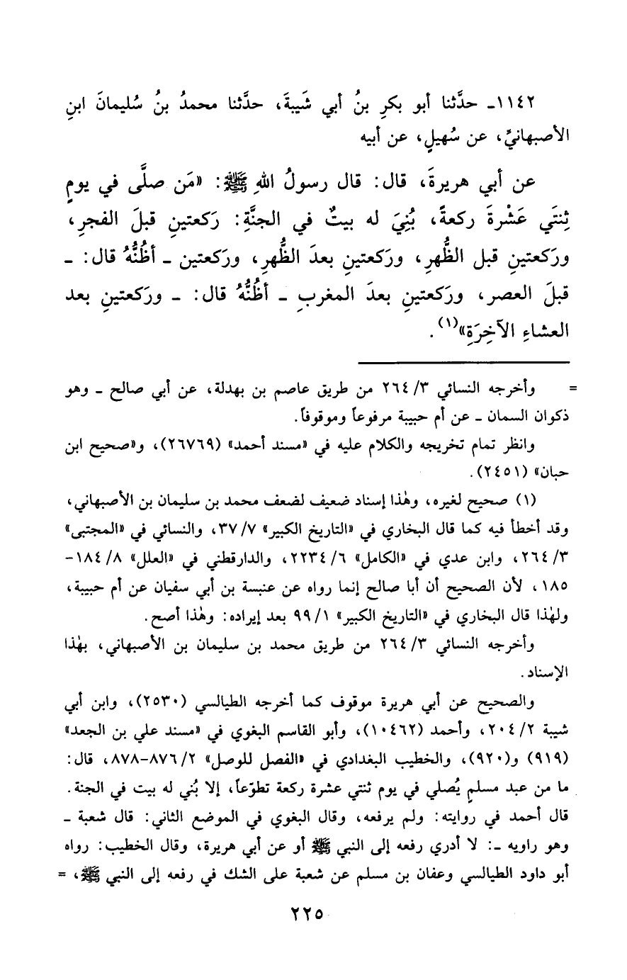 1142- حَدَّثَنَا أَبُو بَكْرِ بْنُ أَبِي شَيْبَةَ ، حَدَّثَنَا مُحَمَّدُ بْنُ سُلَيْمَانَ بْنِ الأَصْبَهَانِيِّ ، عَنْ سُهَيْلٍ ، عَنْ أَبِيهِ ، عَنْ أَبِي هُرَيْرَةَ ، قَالَ : قَالَ رَسُولُ اللهِ صَلَّى الله عَليْهِ وسَلَّمَ : مَنْ صَلَّى فِي يَوْمٍ ثِنْتَيْ عَشْرَةَ رَكْعَةً ، بُنِيَ لَهُ بَيْتٌ فِي الْجَنَّةِ ، رَكْعَتَيْنِ قَبْلَ الْفَجْرِ ، وَرَكْعَتَيْنِ قَبْلَ الظُّهْرِ ، وَرَكْعَتَيْنِ بَعْدَ الظُّهْرِ ، وَرَكْعَتَيْنِ ، أَظُنُّهُ قَالَ : قَبْلَ الْعَصْرِ ، وَرَكْعَتَيْنِ بَعْدَ الْمَغْرِبِ ، أَظُنُّهُ قَالَ : وَرَكْعَتَيْنِ بَعْدَ الْعِشَاءِ الآخِرَةِ.