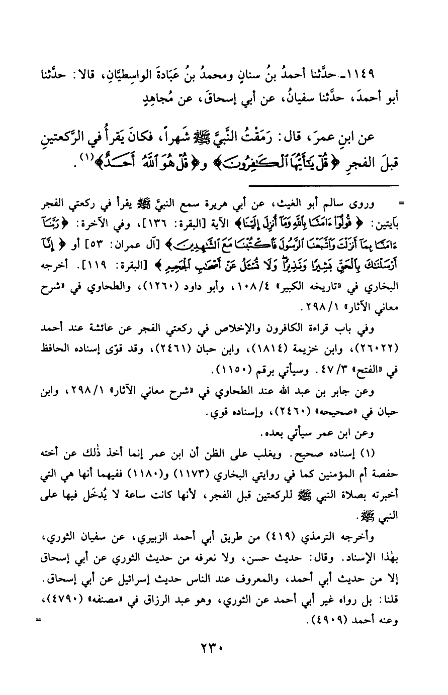 1149- حَدَّثَنَا أَحْمَدُ بْنُ سِنَانٍ ، وَمُحَمَّدُ بْنُ عَبَادَةَ الْوَاسِطِيَّانِ ، قَالاَ : حَدَّثَنَا أَبُو أَحْمَدَ ، حَدَّثَنَا سُفْيَانُ ، عَنْ أَبِي إِسْحَاقَ ، عَنْ مُجَاهِدٍ ، عَنِ ابْنِ عُمَرَ ، قَالَ : رَمَقْتُ النَّبِيَّ صَلَّى الله عَليْهِ وسَلَّمَ شَهْرًا ، فَكَانَ يَقْرَأُ فِي الرَّكْعَتَيْنِ قَبْلَ الْفَجْرِ : {قُلْ يَا أَيُّهَا الْكَافِرُونَ} ، وَ{قُلْ هُوَ اللَّهُ أَحَدٌ}.
