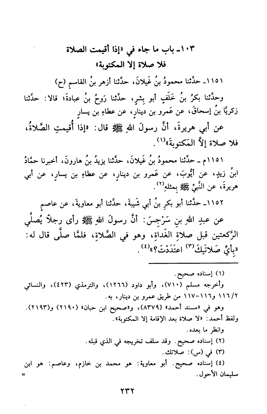 1151- حَدَّثَنَا مَحْمُودُ بْنُ غَيْلاَنَ ، حَدَّثَنَا أَزْهَرُ بْنُ الْقَاسِمِ (ح) وَحَدَّثَنَا بَكْرُ بْنُ خَلَفٍ أَبُو بِشْرٍ ، حَدَّثَنَا رَوْحُ بْنُ عُبَادَةَ ، قَالاَ : حَدَّثَنَا زَكَرِيَّا بْنُ إِسْحَاقَ ، عَنْ عَمْرِو بْنِ دِينَارٍ ، عَنْ عَطَاءِ بْنِ يَسَارٍ ، عَنْ أَبِي هُرَيْرَةَ ، أَنَّ رَسُولَ اللهِ صَلَّى الله عَليْهِ وسَلَّمَ قَالَ : إِذَا أُقِيمَتِ الصَّلاَةُ ، فَلاَ صَلاَةَ إِلاَّ الْمَكْتُوبَةَ.