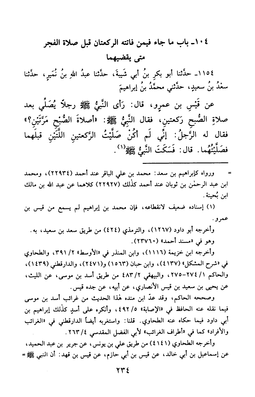 1154- حَدَّثَنَا أَبُو بَكْرِ بْنُ أَبِي شَيْبَةَ ، حَدَّثَنَا عَبْدُ اللهِ بْنُ نُمَيْرٍ ، حَدَّثَنَا سَعْدُ بْنُ سَعِيدٍ , حَدَّثَنِي مُحَمَّدُ بْنُ إِبْرَاهِيمَ ، عَنْ قَيْسِ بْنِ عَمْرٍو ، قَالَ : رَأَى النَّبِيُّ صَلَّى الله عَليْهِ وسَلَّمَ رَجُلاً يُصَلِّي بَعْدَ صَلاَةِ الصُّبْحِ رَكْعَتَيْنِ ، فَقَالَ النَّبِيُّ صَلَّى الله عَليْهِ وسَلَّمَ : أَصَلاَةَ الصُّبْحِ مَرَّتَيْنِ ؟ فَقَالَ لَهُ الرَّجُلُ : إِنِّي لَمْ أَكُنْ صَلَّيْتُ الرَّكْعَتَيْنِ اللَّتَيْنِ قَبْلَهَا ، فَصَلَّيْتُهُمَا , قَالَ : فَسَكَتَ النَّبِيُّ صَلَّى الله عَليْهِ وسَلَّمَ.