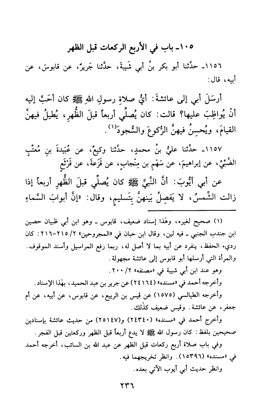 1156- حَدَّثَنَا أَبُو بَكْرِ بْنُ أَبِي شَيْبَةَ ، حَدَّثَنَا جَرِيرٌ ، عَنْ قَابُوسَ ، عَنْ أَبِيهِ ، قَالَ : أَرْسَلَ أَبِي إِلَى عَائِشَةَ : أَيُّ صَلاَةِ رَسُولِ اللهِ صَلَّى الله عَليْهِ وسَلَّمَ كَانَ أَحَبَّ إِلَيْهِ أَنْ يُوَاظِبَ عَلَيْهَا ؟ قَالَتْ : كَانَ يُصَلِّي أَرْبَعًا قَبْلَ الظُّهْرِ ، يُطِيلُ فِيهِنَّ الْقِيَامَ ، وَيُحْسِنُ فِيهِنَّ الرُّكُوعَ وَالسُّجُودَ.