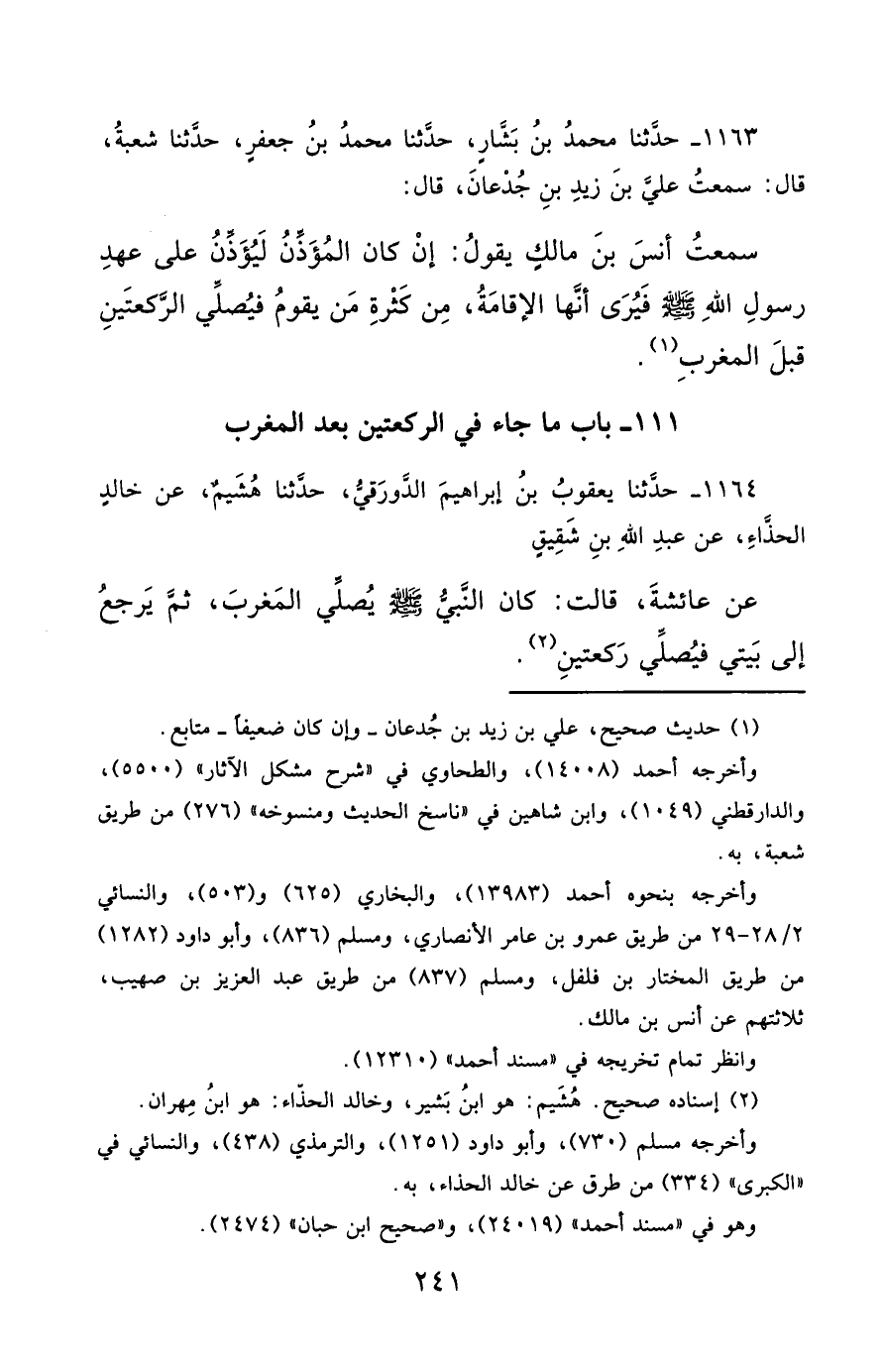 1164- حَدَّثَنَا يَعْقُوبُ بْنُ إِبْرَاهِيمَ الدَّوْرَقِيُّ ، حَدَّثَنَا هُشَيْمٌ ، عَنْ خَالِدٍ الْحَذَّاءِ ، عَنْ عَبْدِ اللهِ بْنِ شَقِيقٍ ، عَنْ عَائِشَةَ ، قَالَتْ : كَانَ النَّبِيُّ صَلَّى الله عَليْهِ وسَلَّمَ يُصَلِّي الْمَغْرِبَ ، ثُمَّ يَرْجِعُ إِلَى بَيْتِي , فَيُصَلِّي رَكْعَتَيْنِ.