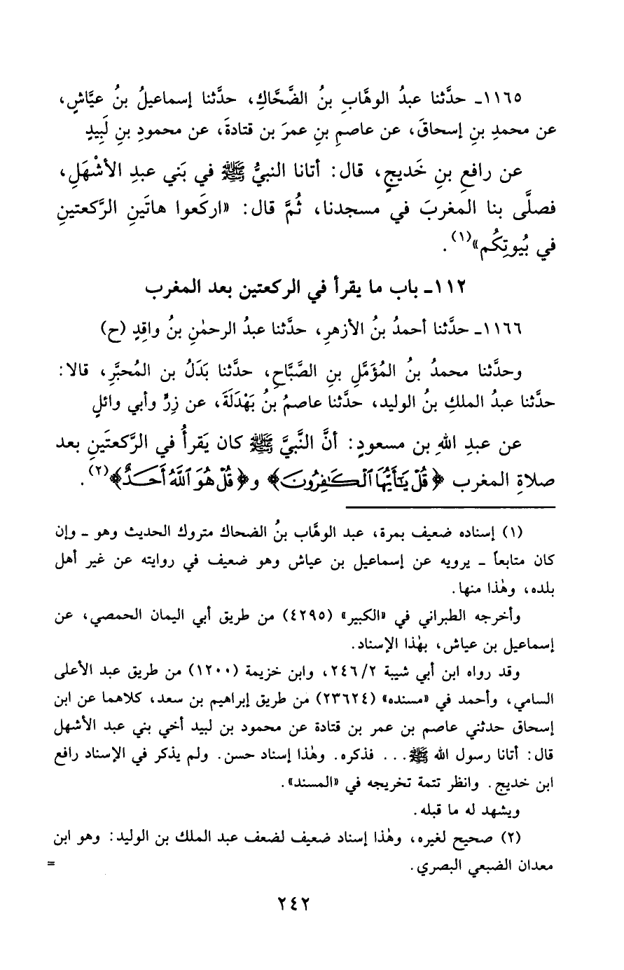 1165- حَدَّثَنَا عَبْدُ الْوَهَّابِ بْنُ الضَّحَّاكِ ، حَدَّثَنَا إِسْمَاعِيلُ بْنُ عَيَّاشٍ ، عَنْ مُحَمَّدِ بْنِ إِسْحَاقَ ، عَنْ عَاصِمِ بْنِ عُمَرَ بْنِ قَتَادَةَ ، عَنْ مَحْمُودِ بْنِ لَبِيدٍ ، عَنْ رَافِعِ بْنِ خَدِيجٍ ، قَالَ : أَتَانَا النَّبِيُّ صَلَّى الله عَليْهِ وسَلَّمَ فِي بَنِي عَبْدِ الأَشْهَلِ ، فَصَلَّى بِنَا الْمَغْرِبَ فِي مَسْجِدِنَا ، ثُمَّ قَالَ : ارْكَعُوا هَاتَيْنِ الرَّكْعَتَيْنِ فِي بُيُوتِكُمْ.