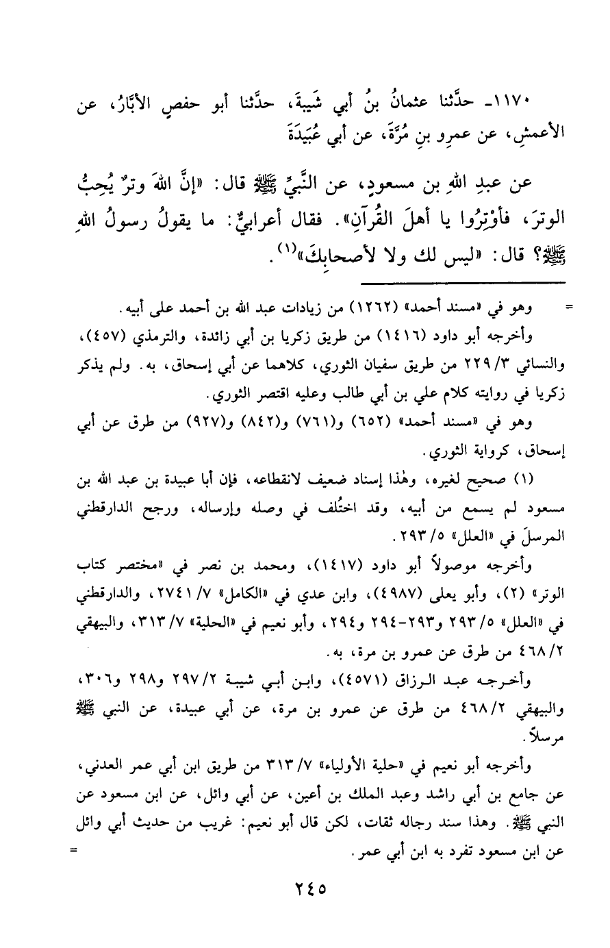 1170- حَدَّثَنَا عُثْمَانُ بْنُ أَبِي شَيْبَةَ ، حَدَّثَنَا أَبُو حَفْصٍ الأَبَّارُ ، عَنِ الأَعْمَشِ ، عَنْ عَمْرِو بْنِ مُرَّةَ ، عَنْ أَبِي عُبَيْدَةَ ، عَنْ عَبْدِ اللهِ بْنِ مَسْعُودٍ ، عَنِ النَّبِيِّ صَلَّى الله عَليْهِ وسَلَّمَ قَالَ : إِنَّ اللَّهَ وِتْرٌ يُحِبُّ الْوِتْرَ , فَأَوْتِرُوا يَا أَهْلَ الْقُرْآنِ , فَقَالَ أَعْرَابِيٌّ : مَا يَقُولُ رَسُولُ اللهِ صَلَّى الله عَليْهِ وسَلَّمَ ؟ قَالَ : لَيْسَ لَكَ وَلاَ لأَصْحَابِكَ.