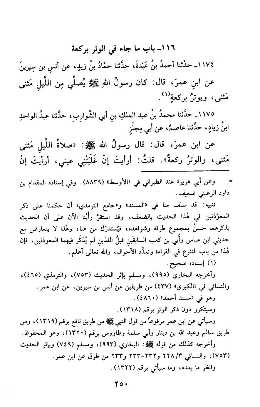 1174- حَدَّثَنَا أَحْمَدُ بْنُ عَبْدَةَ ، حَدَّثَنَا حَمَّادُ بْنُ زَيْدٍ ، عَنْ أَنَسِ بْنِ سِيرِينَ ، عَنِ ابْنِ عُمَرَ ، قَالَ : كَانَ رَسُولُ اللهِ صَلَّى الله عَليْهِ وسَلَّمَ يُصَلِّي مِنَ اللَّيْلِ مَثْنَى مَثْنَى ، وَيُوتِرُ بِرَكْعَةٍ.