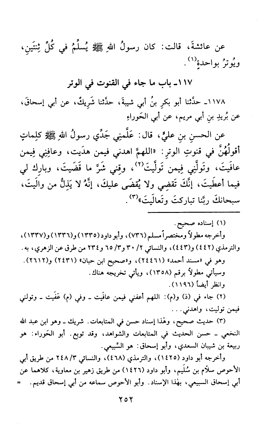 1178- حَدَّثَنَا أَبُو بَكْرِ بْنُ أَبِي شَيْبَةَ ، حَدَّثَنَا شَرِيكٌ ، عَنْ أَبِي إِسْحَاقَ ، عَنْ بُرَيْدِ بْنِ أَبِي مَرْيَمَ ، عَنْ أَبِي الْحَوْرَاءِ ، عَنِ الْحَسَنِ بْنِ عَلِيٍّ ، قَالَ : عَلَّمَنِي جَدِّي رَسُولُ اللهِ صَلَّى الله عَليْهِ وسَلَّمَ كَلِمَاتٍ أَقُولُهُنَّ فِي قُنُوتِ الْوِتْرِ : اللَّهُمَّ اهْدِنِي فِيمَنْ هَدَيْتَ , وَعَافِنِي فِيمَنْ عَافَيْتَ ، وَتَوَلَّنِي فِيمَنْ تَوَلَّيْتَ ، وَقِنِي شَرَّ مَا قَضَيْتَ ، وَبَارِكْ لِي فِيمَا أَعْطَيْتَ ، إِنَّكَ تَقْضِي وَلاَ يُقْضَى عَلَيْكَ ، إِنَّهُ لاَ يَذِلُّ مَنْ وَالَيْتَ ، سُبْحَانَكَ رَبَّنَا تَبَارَكْتَ وَتَعَالَيْتَ.