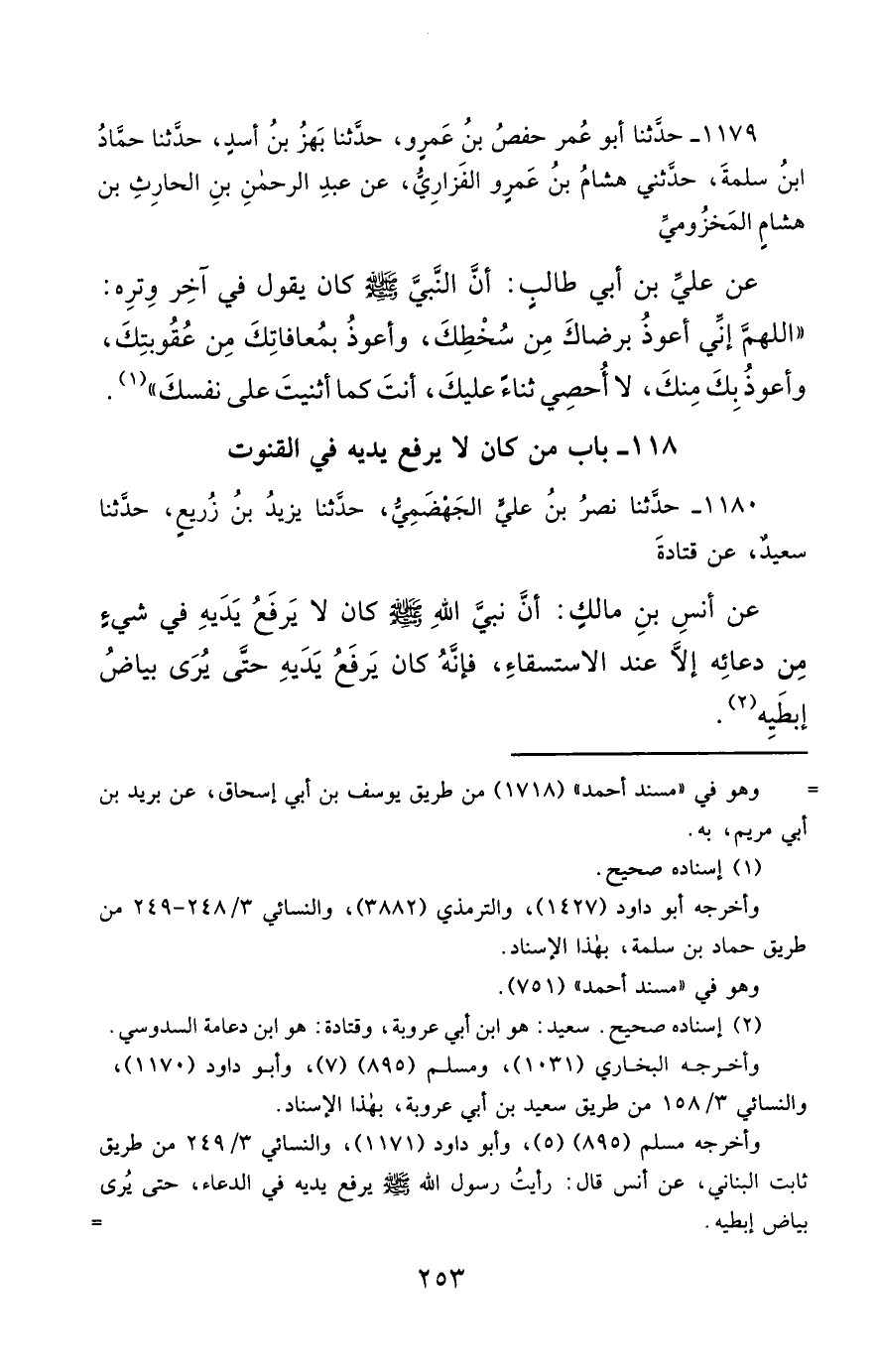1179- حَدَّثَنَا أَبُو عُمَرَ حَفْصُ بْنُ عَمْرٍو ، حَدَّثَنَا بَهْزُ بْنُ أَسَدٍ ، حَدَّثَنَا حَمَّادُ بْنُ سَلَمَةَ , حَدَّثَنِي هِشَامُ بْنُ عَمْرٍو الْفَزَارِيُّ ، عَنْ عَبْدِ الرَّحْمَنِ بْنِ الْحَارِثِ بْنِ هِشَامٍ الْمَخْزُومِيِّ ، عَنْ عَلِيِّ بْنِ أَبِي طَالِبٍ ، أَنَّ النَّبِيَّ صَلَّى الله عَليْهِ وسَلَّمَ كَانَ يَقُولُ فِي آخِرِ وِتْرِهِ : اللَّهُمَّ إِنِّي أَعُوذُ بِرِضَاكَ مِنْ سُخْطِكَ ، وَأَعُوذُ بِمُعَافَاتِكَ مِنْ عُقُوبَتِكَ ، وَأَعُوذُ بِكَ مِنْكَ ، لاَ أُحْصِي ثَنَاءً عَلَيْكَ ، أَنْتَ كَمَا أَثْنَيْتَ نَفْسِكَ.