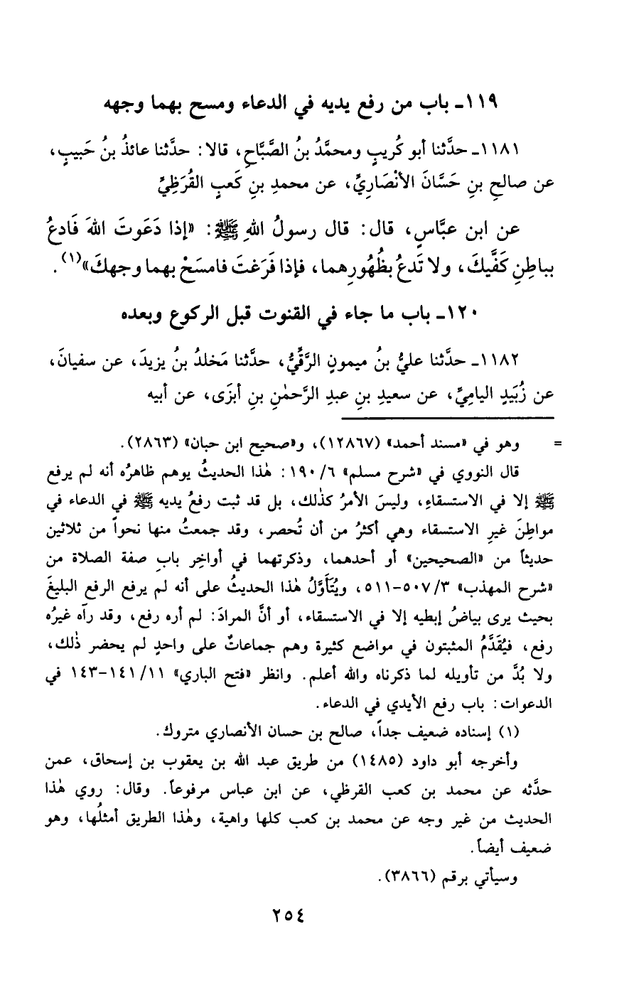 1181- حَدَّثَنَا أَبُو كُرَيْبٍ ، وَمُحَمَّدُ بْنُ الصَّبَّاحِ ، قَالاَ : حَدَّثَنَا عَائِذُ بْنُ حَبِيبٍ ، عَنْ صَالِحِ بْنِ حَسَّانَ الأَنْصَارِيِّ ، عَنْ مُحَمَّدِ بْنِ كَعْبٍ الْقُرَظِيِّ ، عَنِ ابْنِ عَبَّاسٍ ، قَالَ : قَالَ رَسُولُ اللهِ صَلَّى الله عَليْهِ وسَلَّمَ : إِذَا دَعَوْتَ اللَّهَ , فَادْعُ بِبَاطِنِ كَفَّيْكَ ، وَلاَ تَدْعُ بِظُهُورِهِمَا ، فَإِذَا فَرَغْتَ , فَامْسَحْ بِهِمَا وَجْهَكَ.