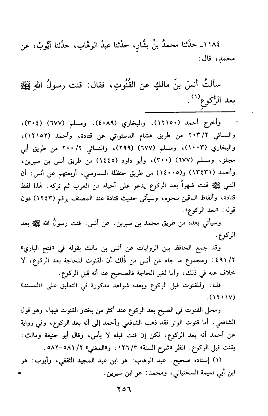 1184- حَدَّثَنَا مُحَمَّدُ بْنُ بَشَّارٍ ، حَدَّثَنَا عَبْدُ الْوَهَّابِ ، حَدَّثَنَا أَيُّوبُ ، عَنْ مُحَمَّدٍ ، قَالَ : سَأَلْتُ أَنَسَ بْنَ مَالِكٍ عَنِ الْقُنُوتِ ، فَقَالَ : قَنَتَ رَسُولُ اللهِ صَلَّى الله عَليْهِ وسَلَّمَ بَعْدَ الرُّكُوعِ.