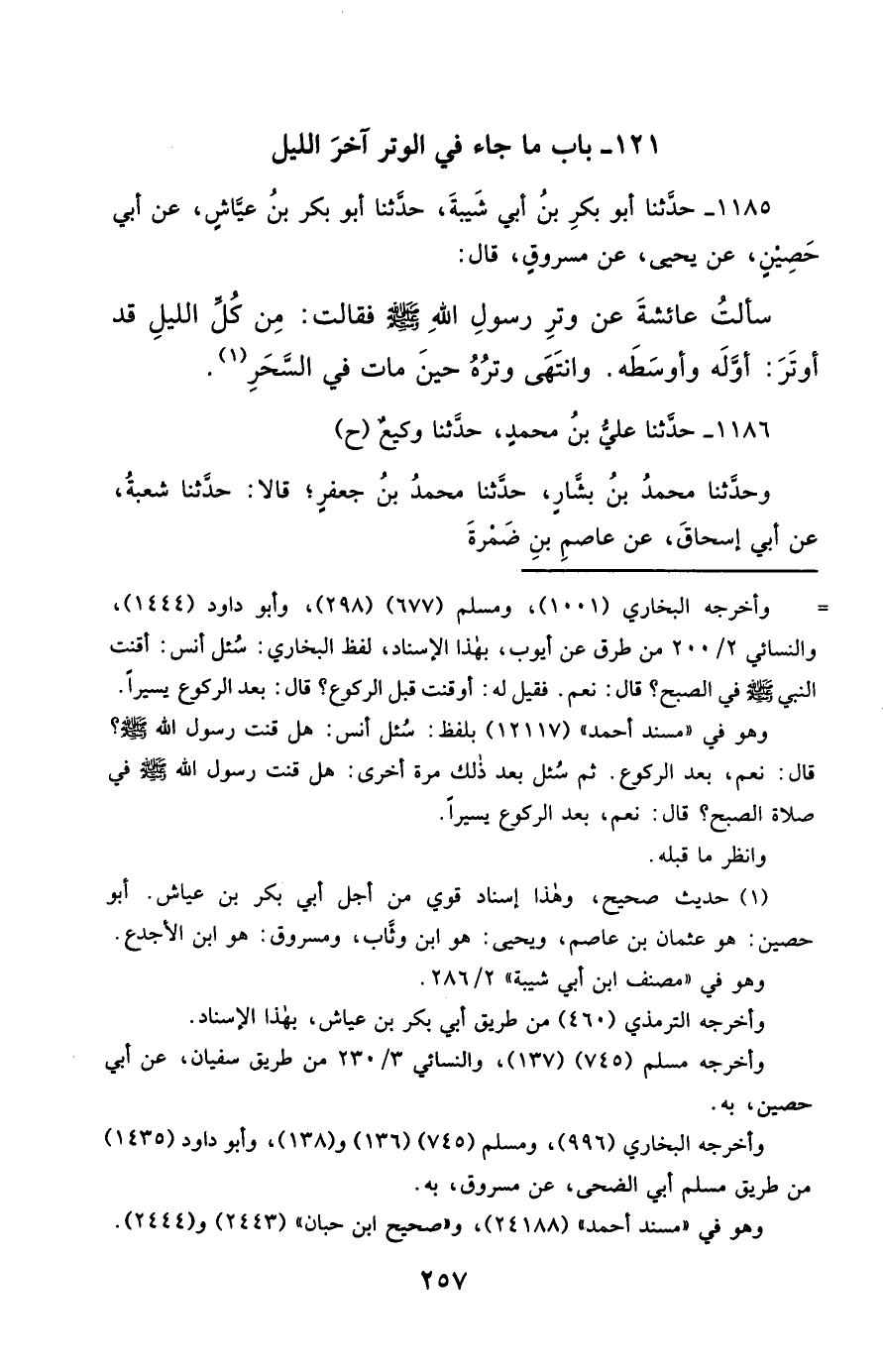 1185- حَدَّثَنَا أَبُو بَكْرِ بْنُ أَبِي شَيْبَةَ ، حَدَّثَنَا أَبُو بَكْرِ بْنُ عَيَّاشٍ ، عَنْ أَبِي حَصِينٍ ، عَنْ يَحْيَى ، عَنْ مَسْرُوقٍ ، قَالَ : سَأَلْتُ عَائِشَةَ عَنْ وِتْرِ رَسُولِ اللهِ صَلَّى الله عَليْهِ وسَلَّمَ ، فَقَالَتْ : مِنْ كُلِّ اللَّيْلِ قَدْ أَوْتَرَ : أَوَّلَهُ , وَأَوْسَطَهُ ، وَانْتَهَى وِتْرُهُ حِينَ مَاتَ فِي السَّحَرِ.